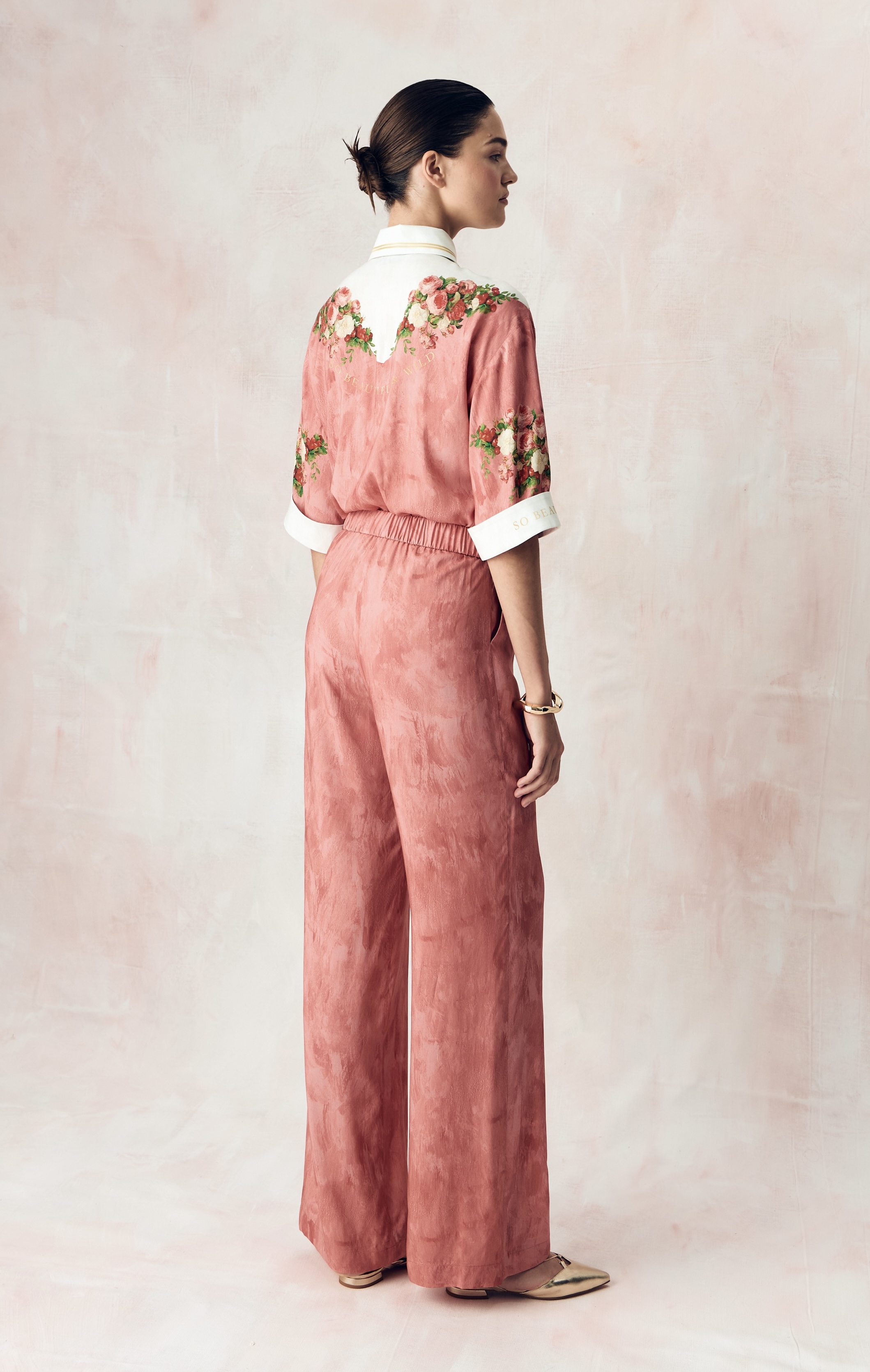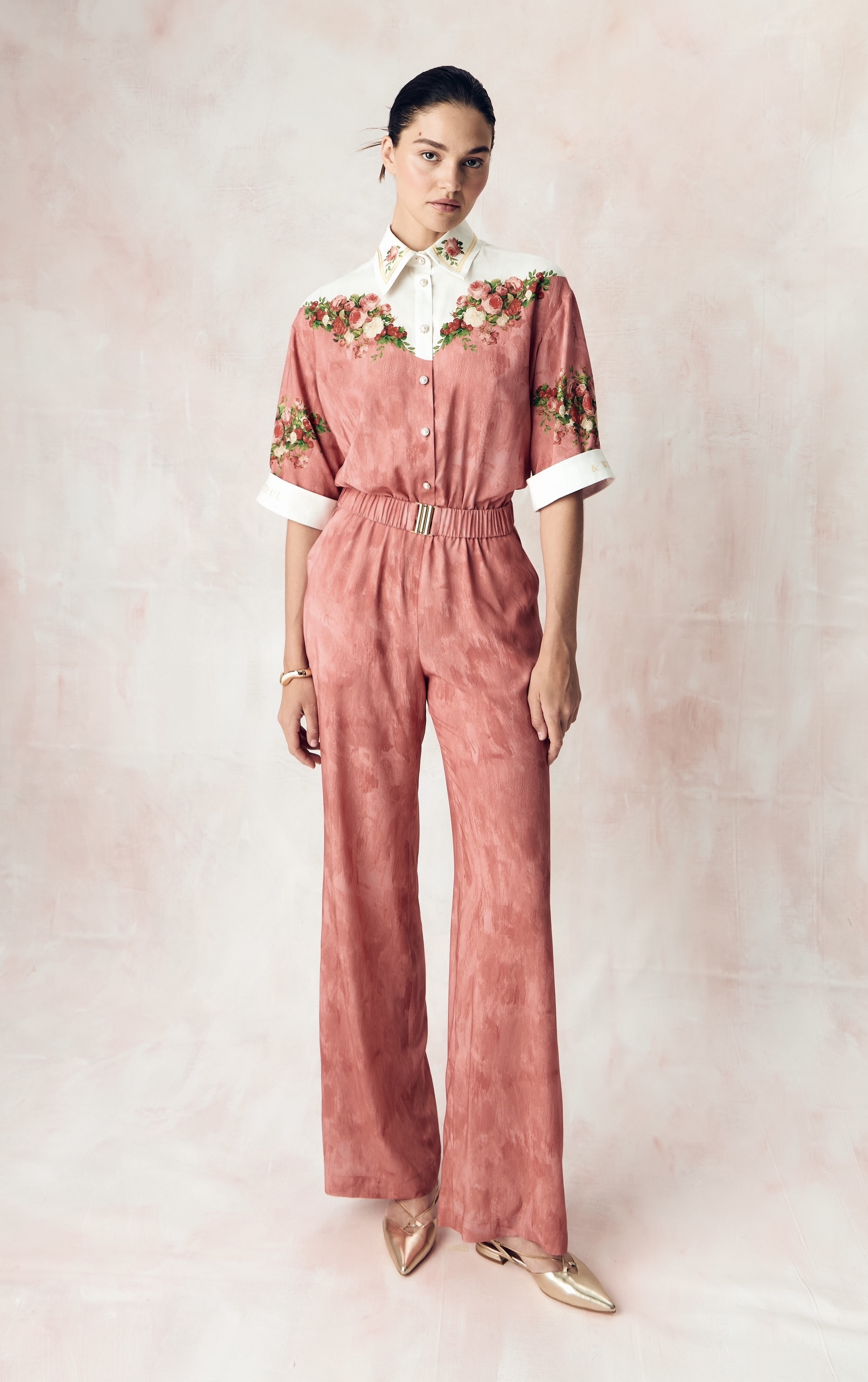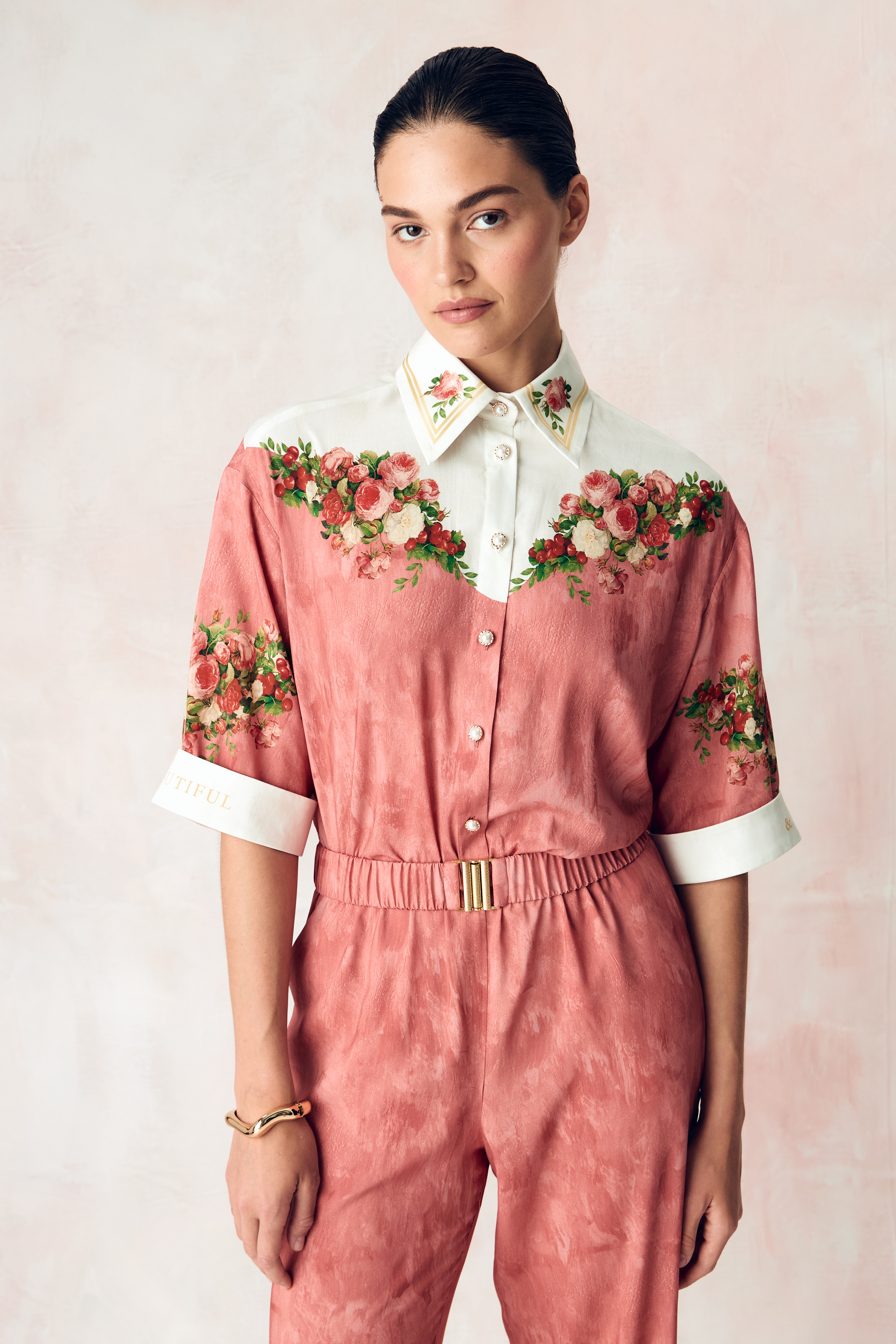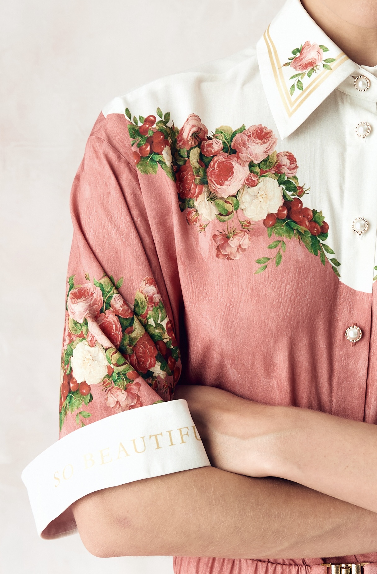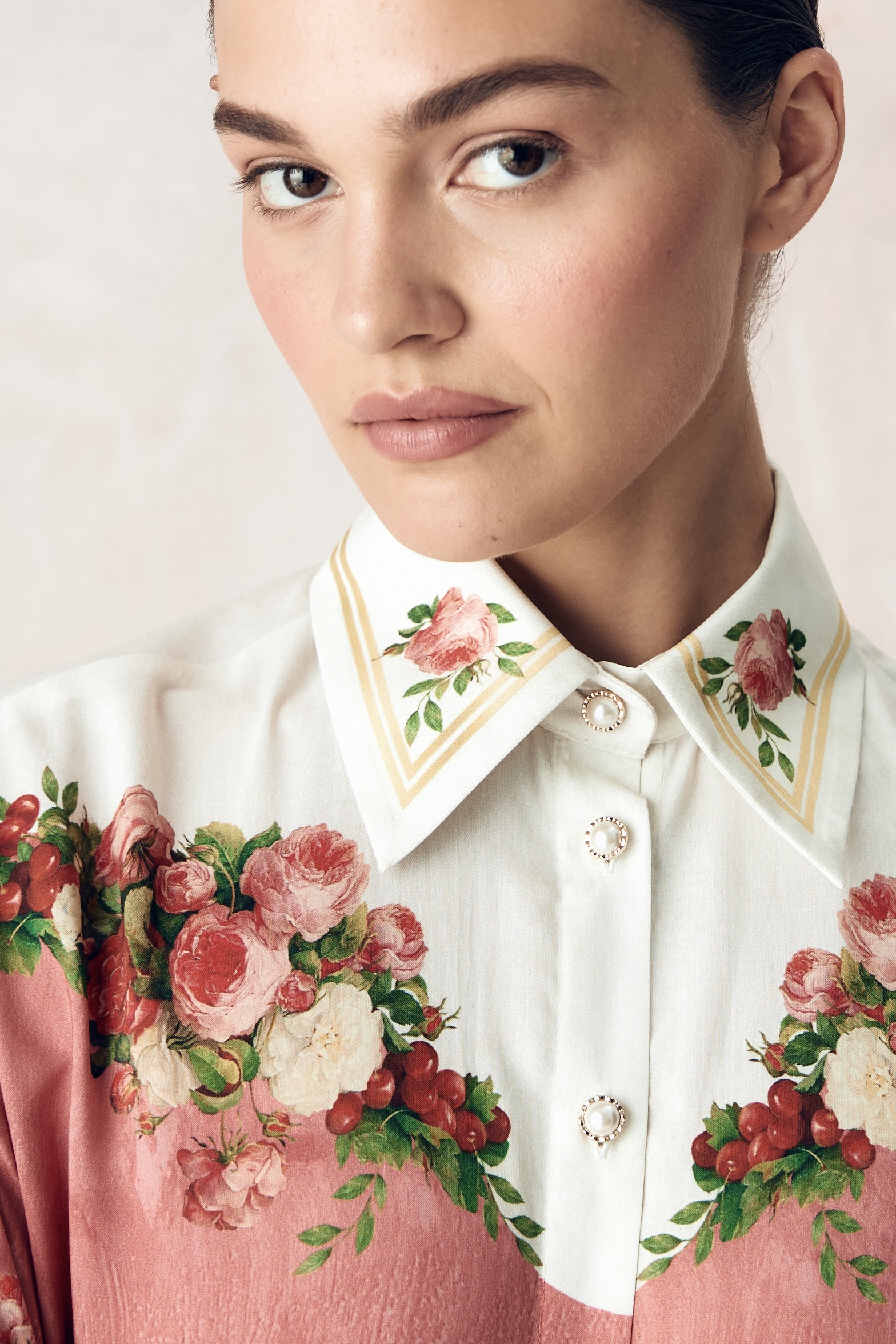 Композиция принта направляет нас к образу женщины. Цветы, наделенные скрытым смыслом, отражают не только особый символизм, но демонстрируют богатство земных даров, изобилие и красоту мира, силу и статус свой обладательницы. Нежный розовый тон прекрасно сочетает в себе роскошные оттенки, служащие фоном для ярких вишнёвых акцентов, что добавляет глубину и визуальную привлекательность.
