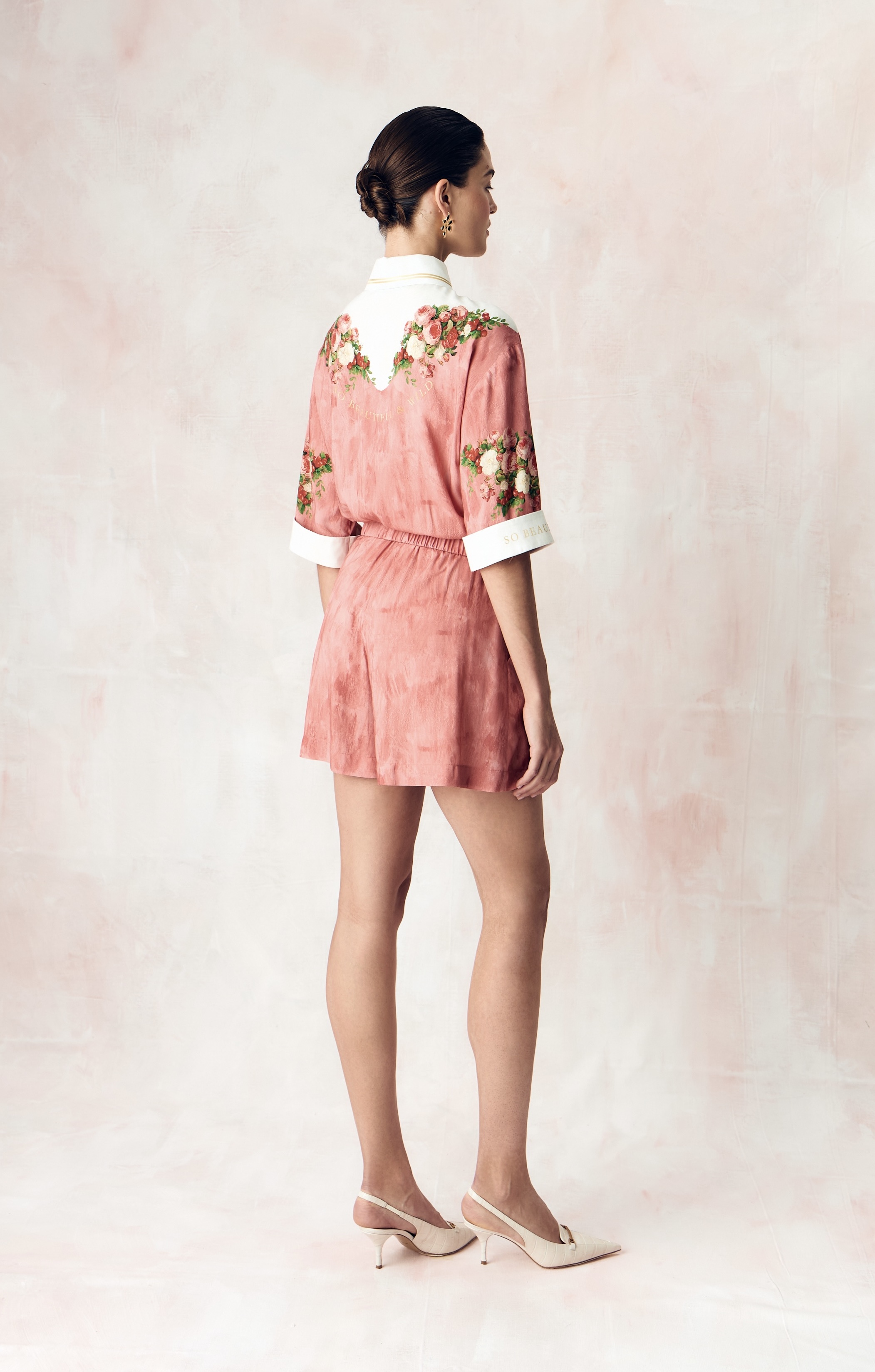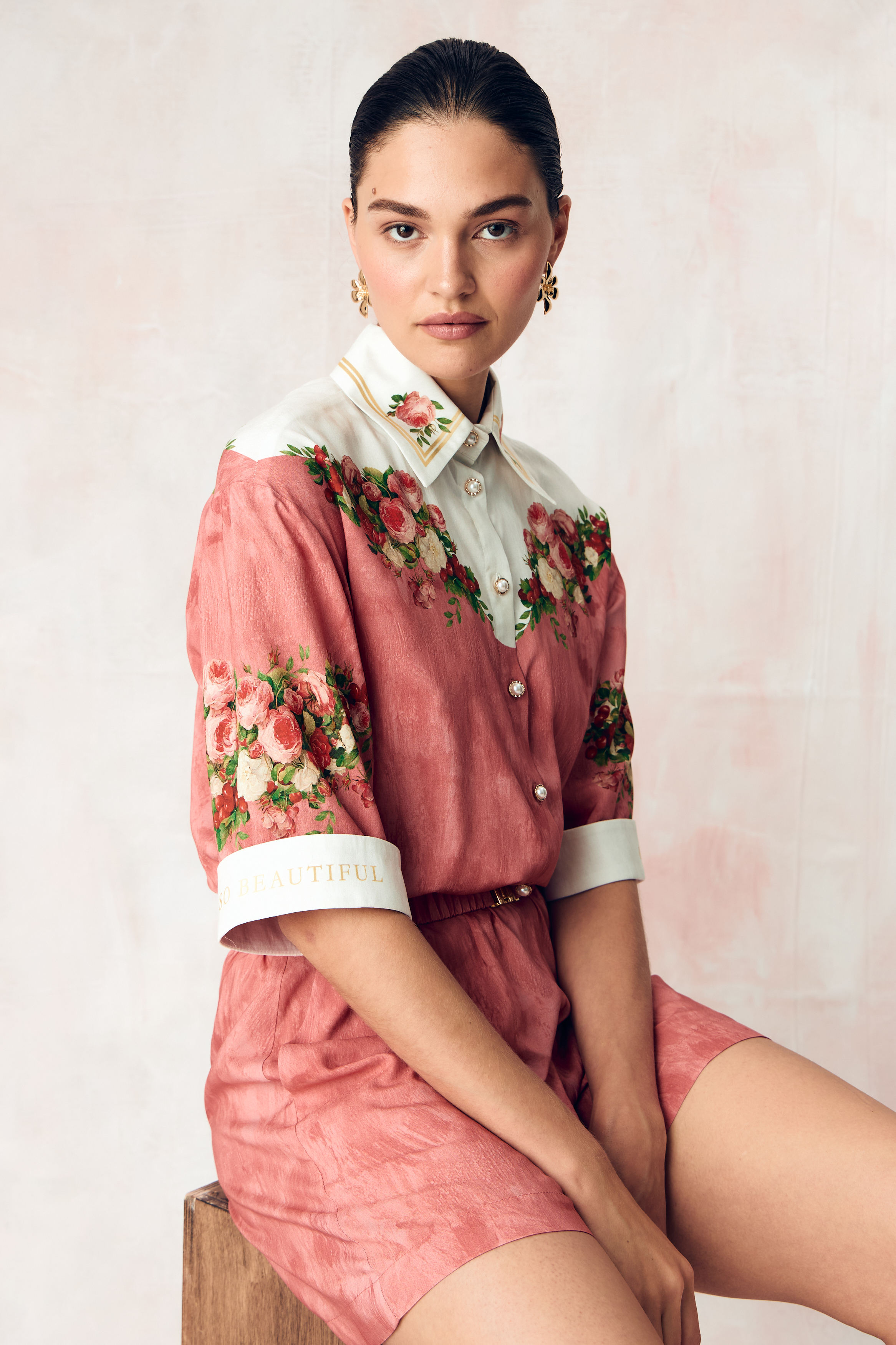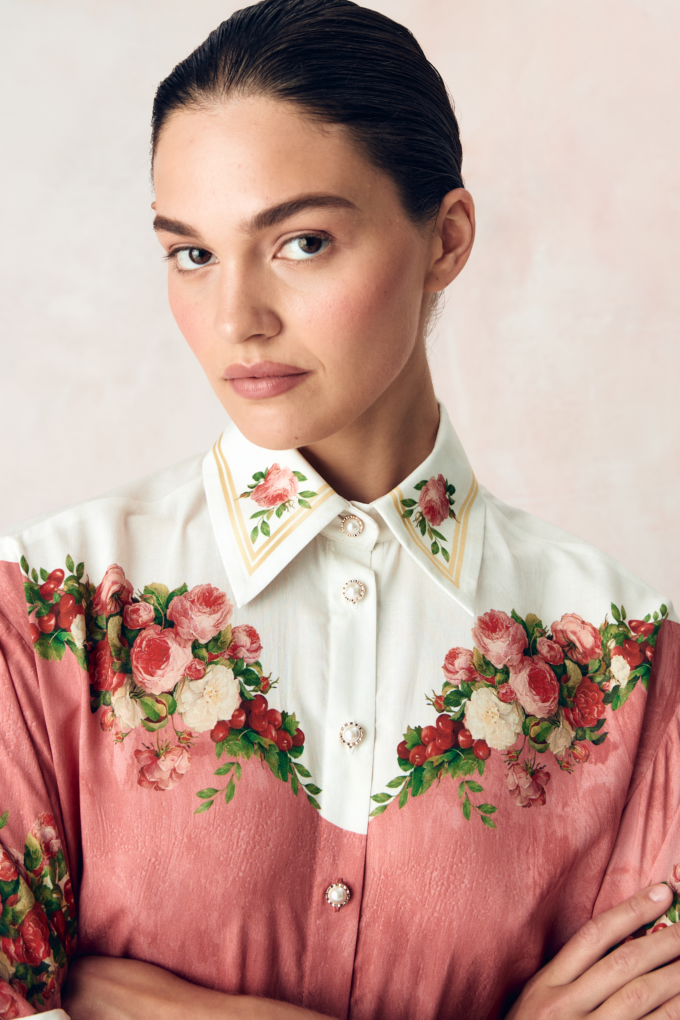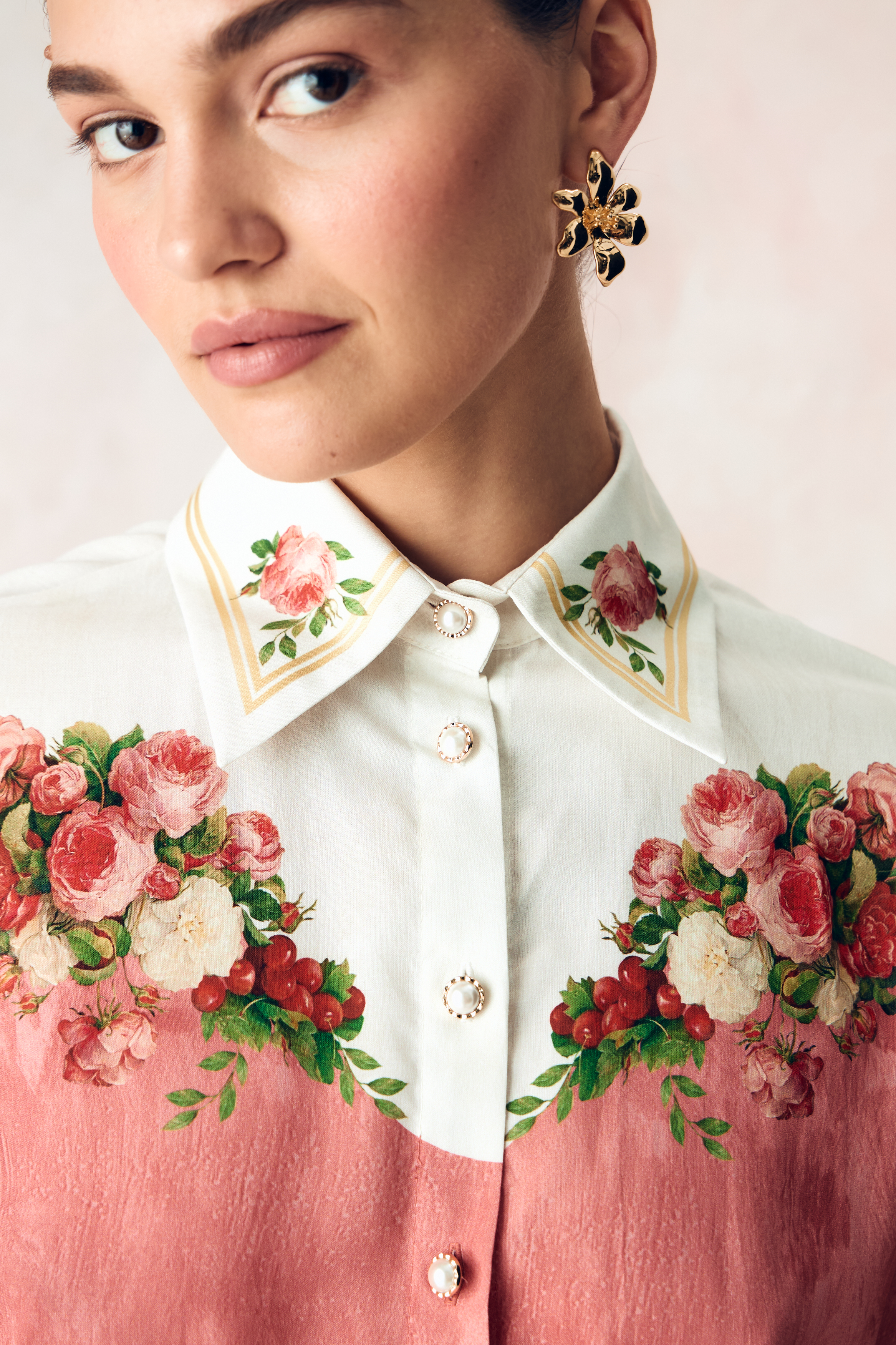Композиция принта направляет нас к образу женщины. Цветы, наделенные скрытым смыслом, отражают не только особый символизм, но демонстрируют богатство земных даров, изобилие и красоту мира, силу и статус свой обладательницы. Нежный розовый тон прекрасно сочетает в себе роскошные оттенки, служащие фоном для ярких вишнёвых акцентов, что добавляет глубину и визуальную привлекательность.
