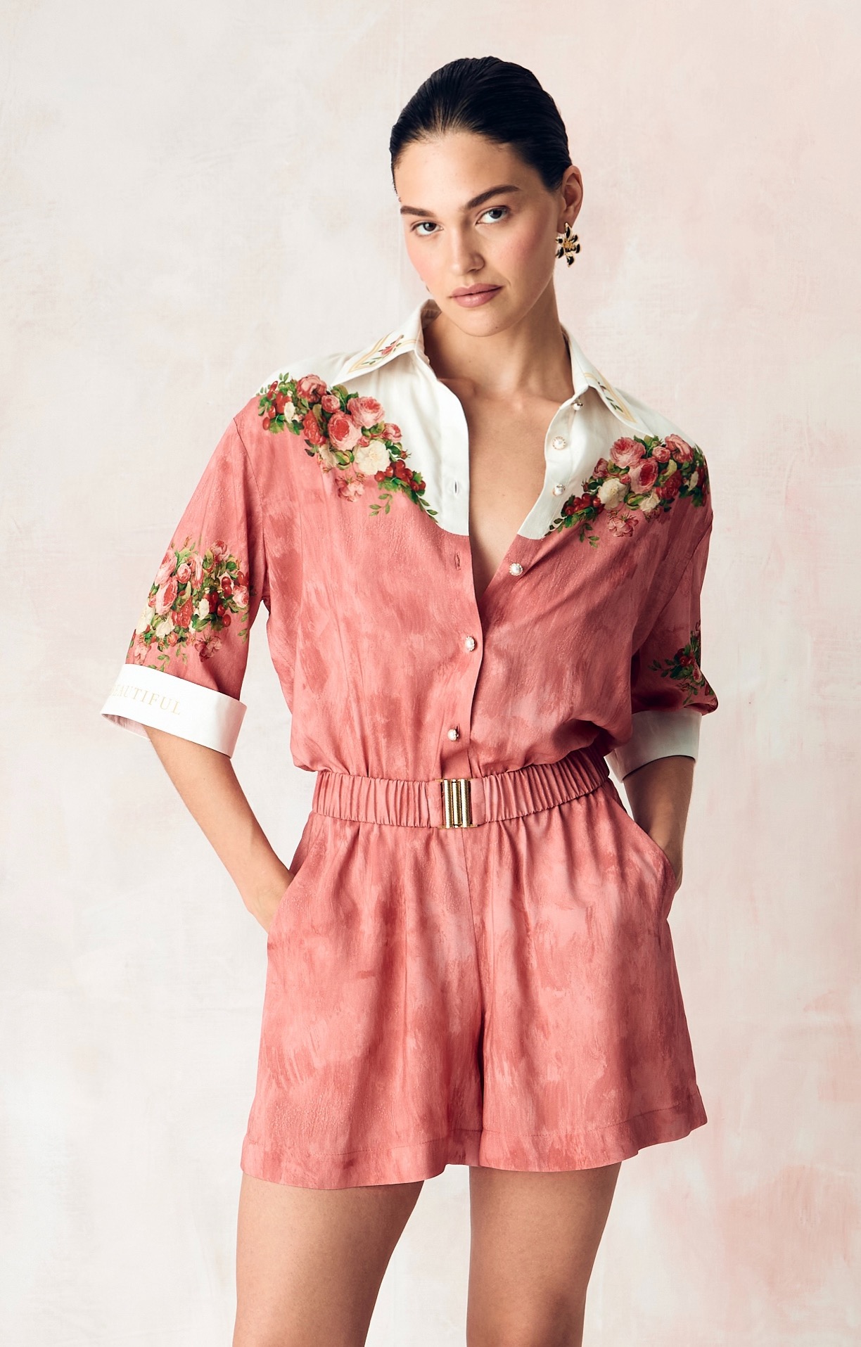 Комбинезон в длине мини из сатиновой стрейч вискозы с авторским принтом "НАТЮРМОРТ.ПИОНЫ И ВИШНИ."