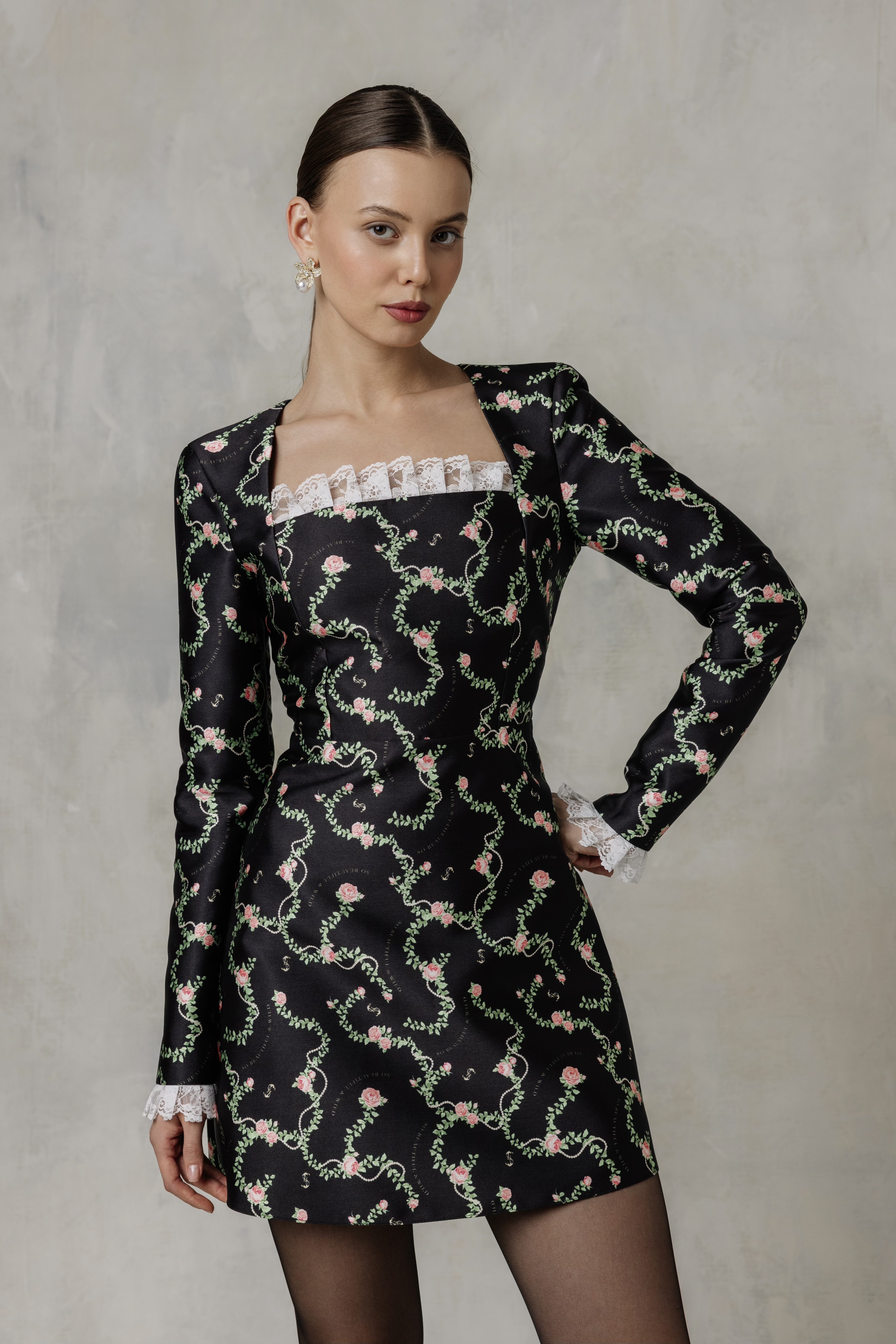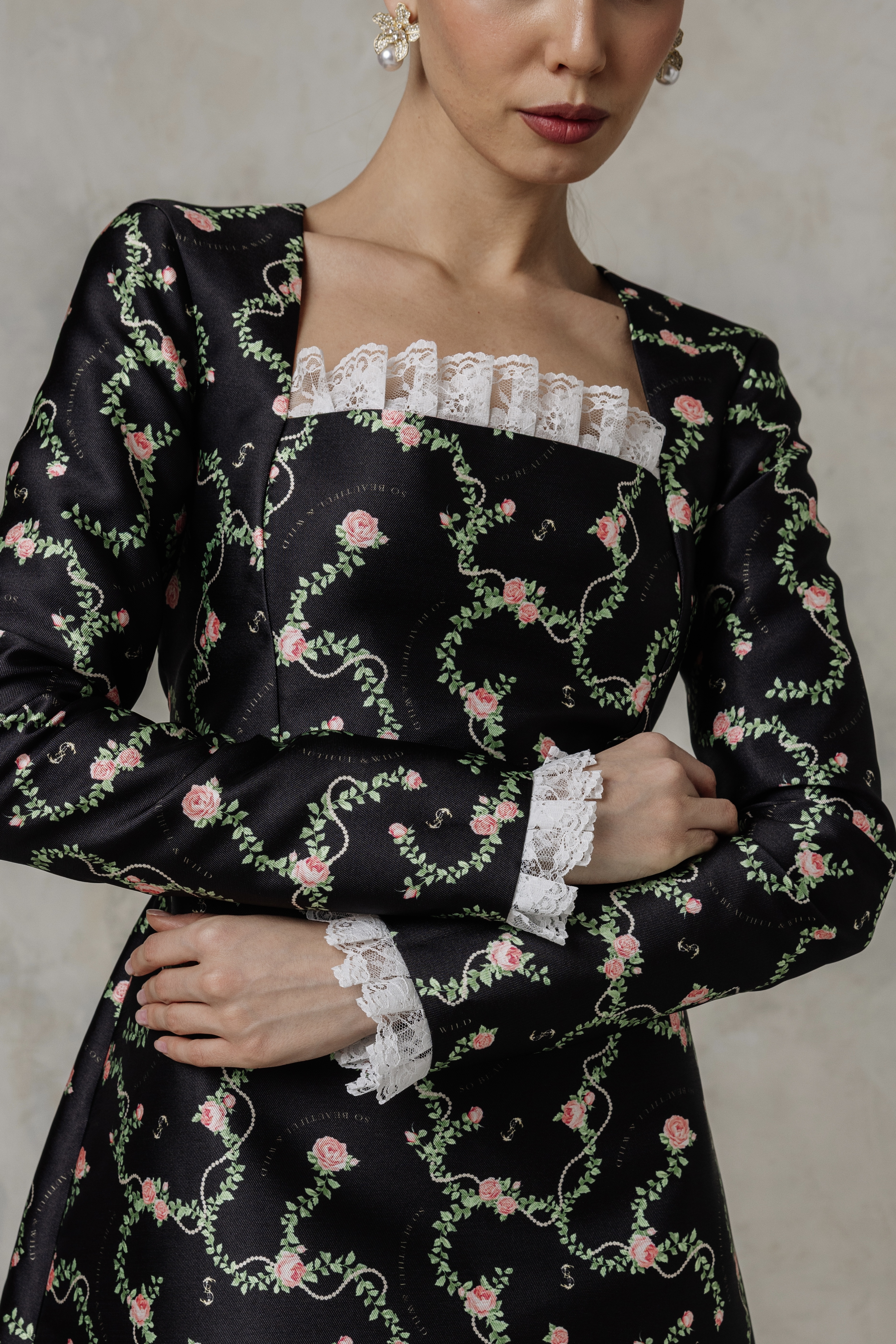 Цветочный узор из бутонов роз нежного розового оттенка переплетается с мерцающей жемчужной нитью на контрастном черном фоне. Этот принт вдохновлен платьем Маркизы де Помпадур, фаворитки короля Людовика XV, кисти художника Франсуа Буше. Он отражает атмосферу французской роскоши и романтики XVIII века.