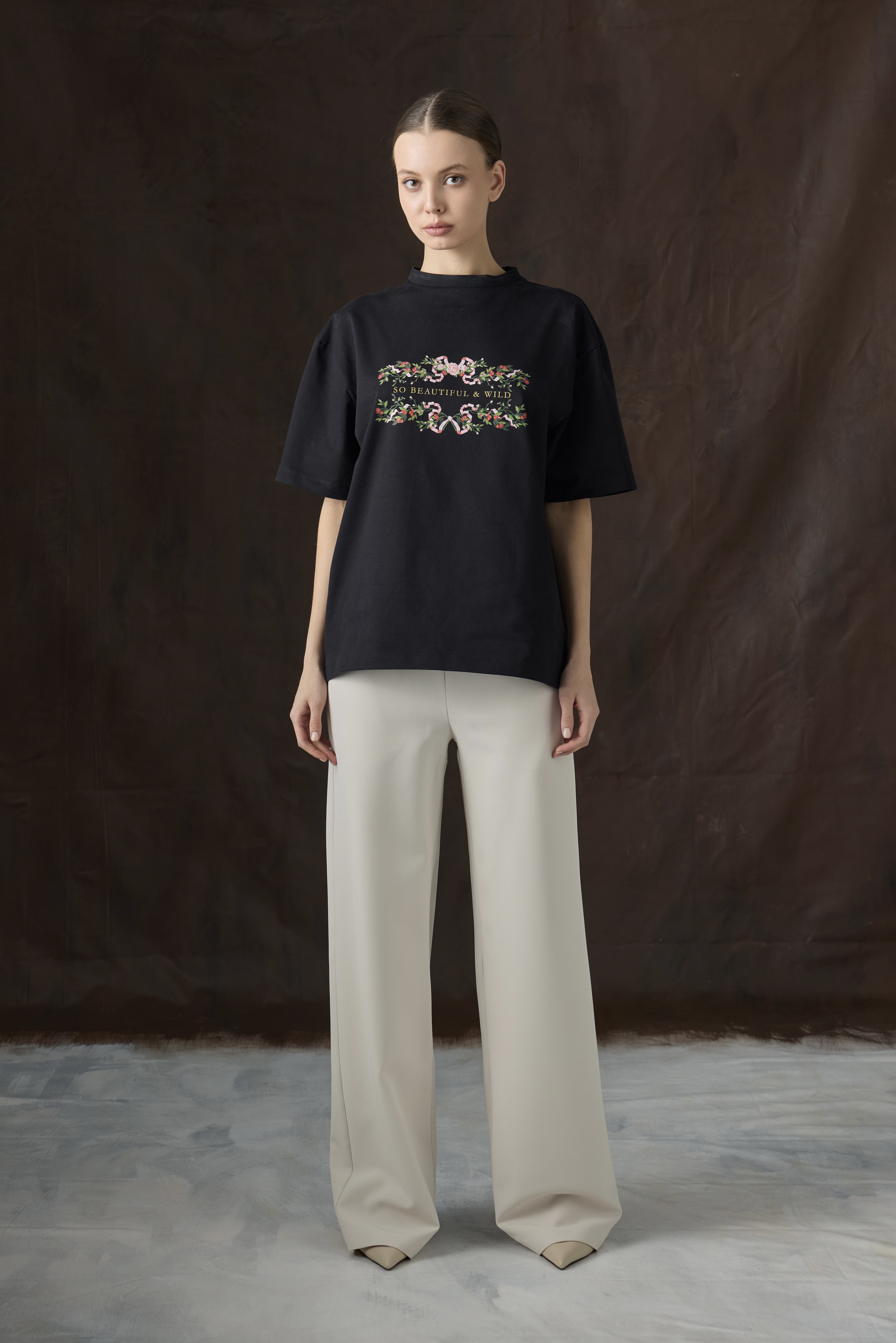 Сердцем композиции является название бренда, выполненное золотым шрифтом, которое сверкает, словно волшебная нить, соединяющая традиции прошлого и тенденции настоящего. Этот принт доступен для классических свитшотов в черном цвете, открывая возможности дополнить практичные кэжуал-образы капелькой королевской роскоши.