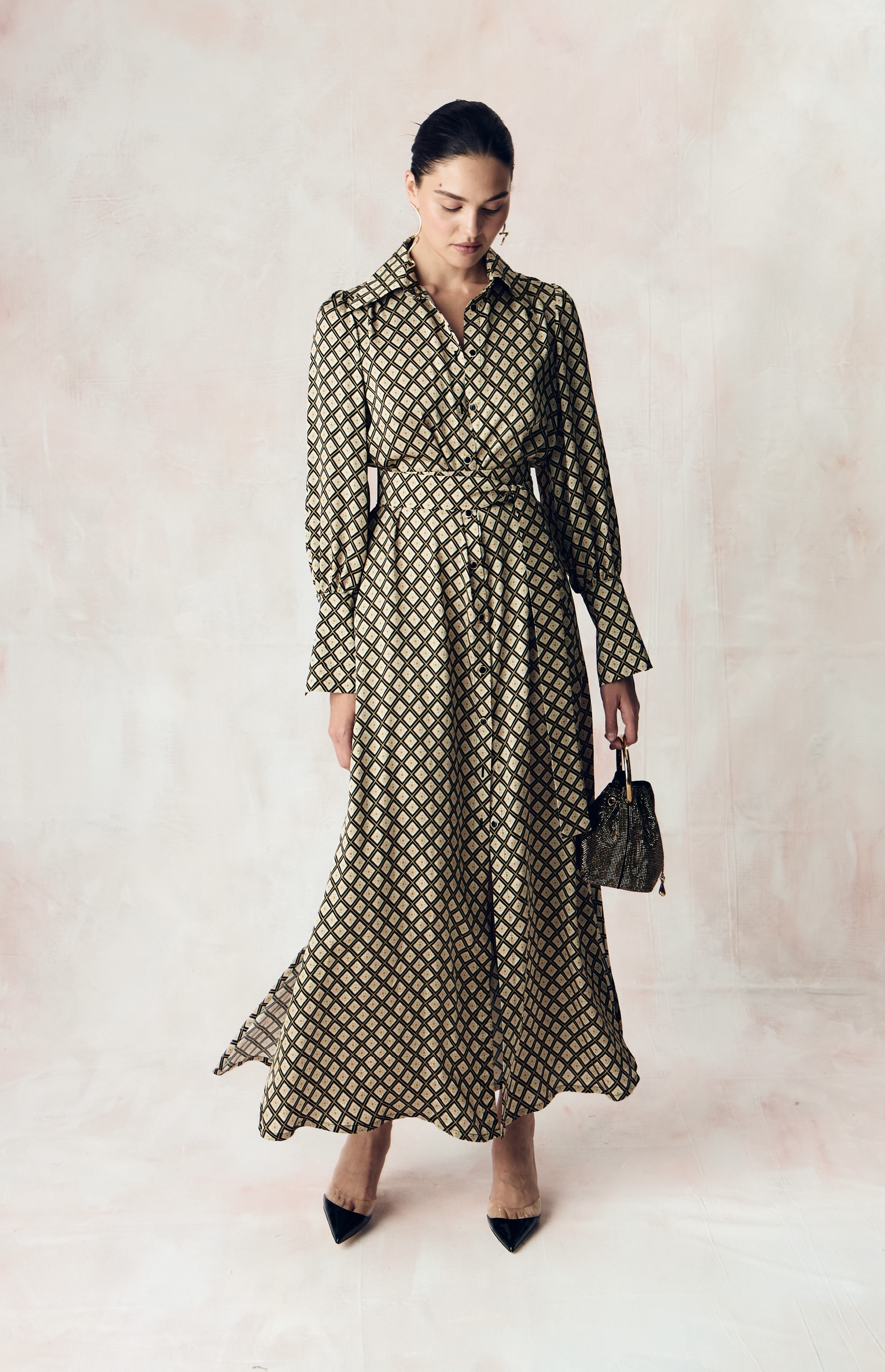 Симметричный ромбовидный орнамент с золотыми виньетками на молочном фоне излучает ауру утонченности и превосходства. Этот принт, вдохновленный эстетикой рококо, завоевывает взгляды своими изящными причудливыми формами, каждый элемент принта создан для того, чтобы подчеркнуть исключительный вкус и статус своей обладательницы.