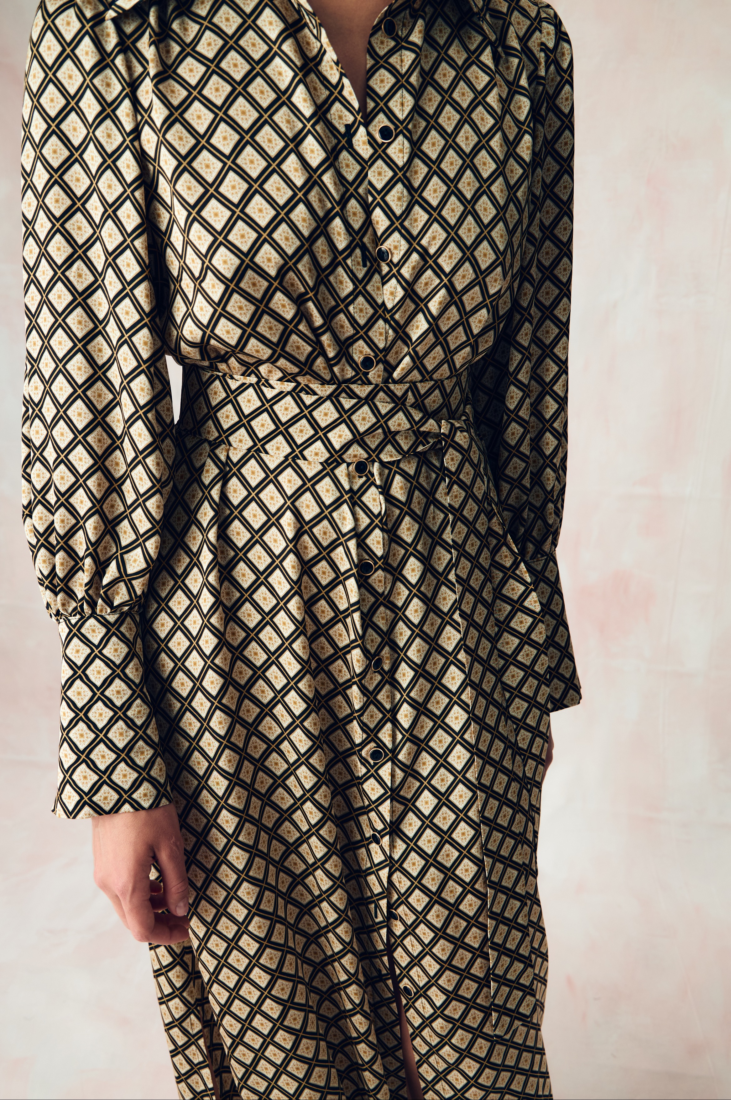 Авторский принт "ЮВЕЛИРНАЯ ГЕОМЕТРИЯ.ЗОЛОТО" по заказу SO BEAUTIFUL&WILD нанесен на экологичную сатиновую стрейч вискозу категории люкс на заводе в Италии с использованием самого высокотехнологичного оборудования в мире за счет которого обеспечивается великолепное качество печати и передача задуманного дизанером цвета с богатой детализацией рисунка.