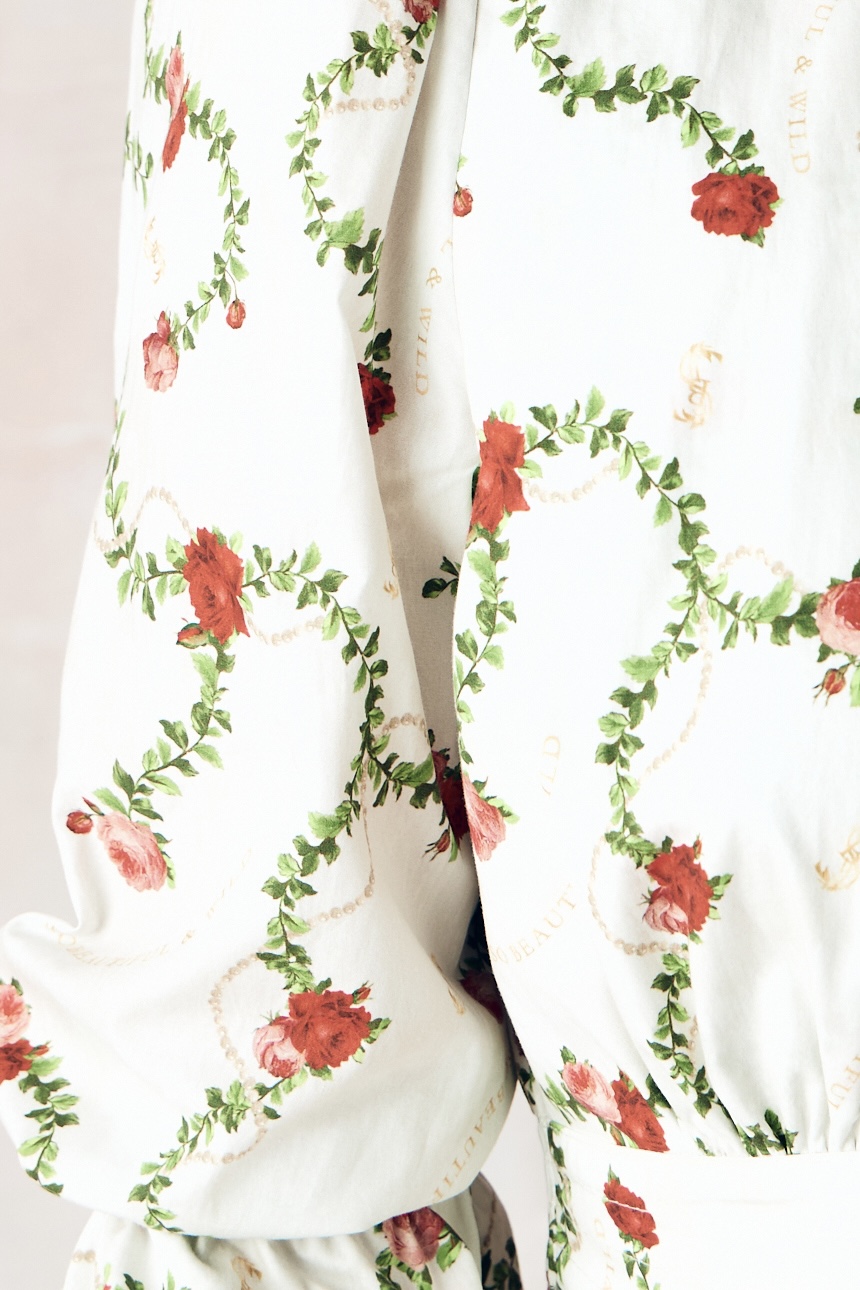 Цветочный узор из бутонов роз нежного розового оттенка переплетается с мерцающей жемчужной нитью на освежающем сливочном фоне. Этот принт вдохновлен платьем Маркизы де Помпадур, фаворитки короля Людовика XV, кисти художника Франсуа Буше. Он отражает атмосферу французской роскоши и романтики XVIII века.