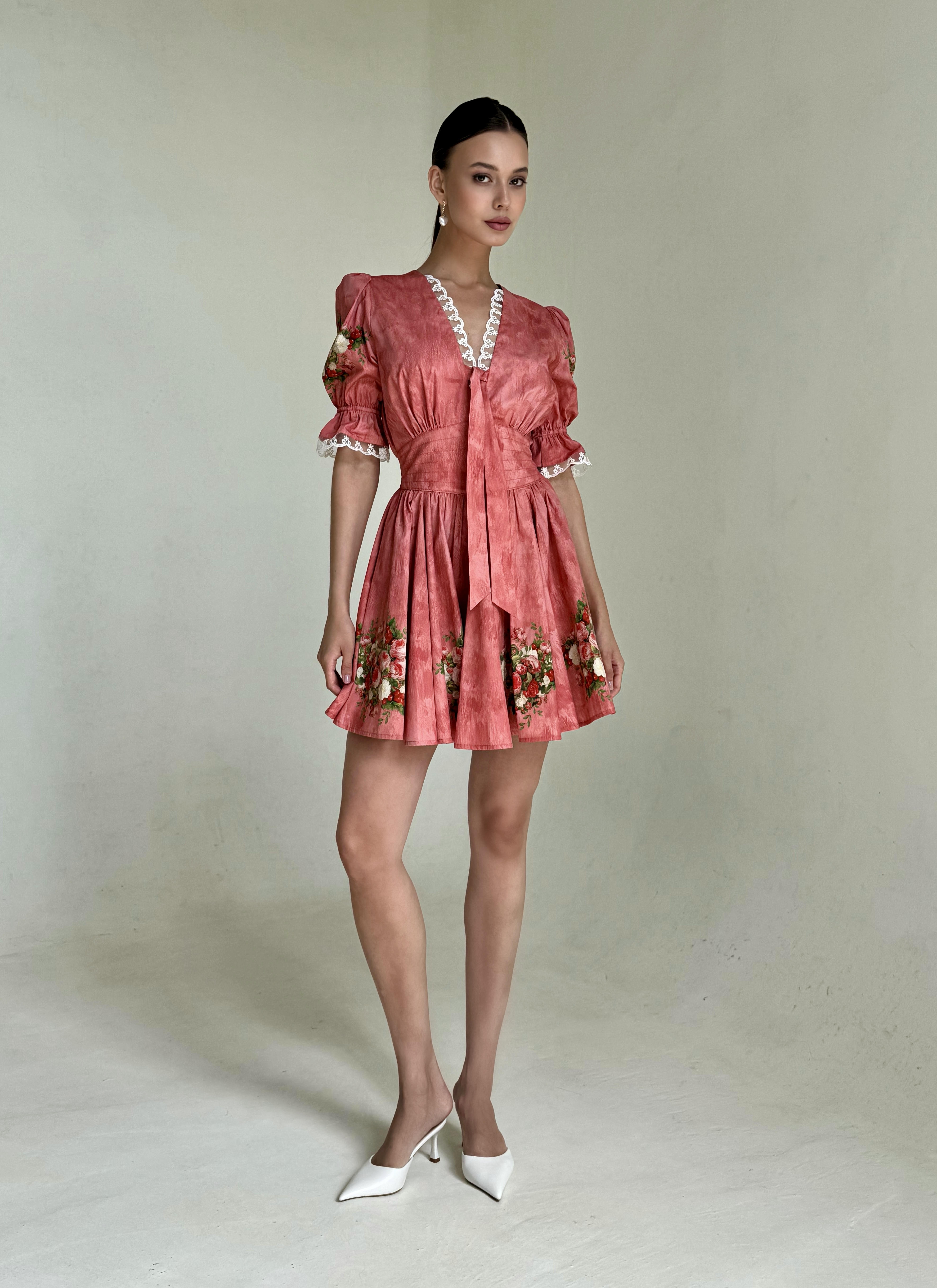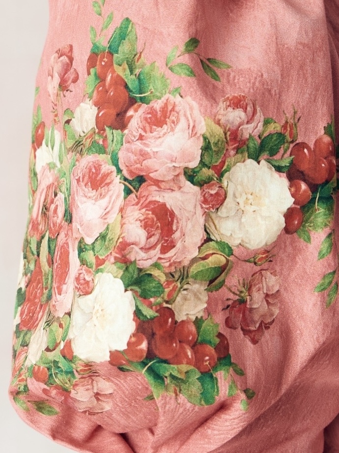Композиция принта направляет нас к образу женщины. Цветы, наделенные скрытым смыслом, отражают не только особый символизм, но демонстрируют богатство земных даров, изобилие и красоту мира, силу и статус свой обладательницы. Нежный розовый тон прекрасно сочетает в себе роскошные оттенки, служащие фоном для ярких вишнёвых акцентов, что добавляет глубину и визуальную привлекательность.