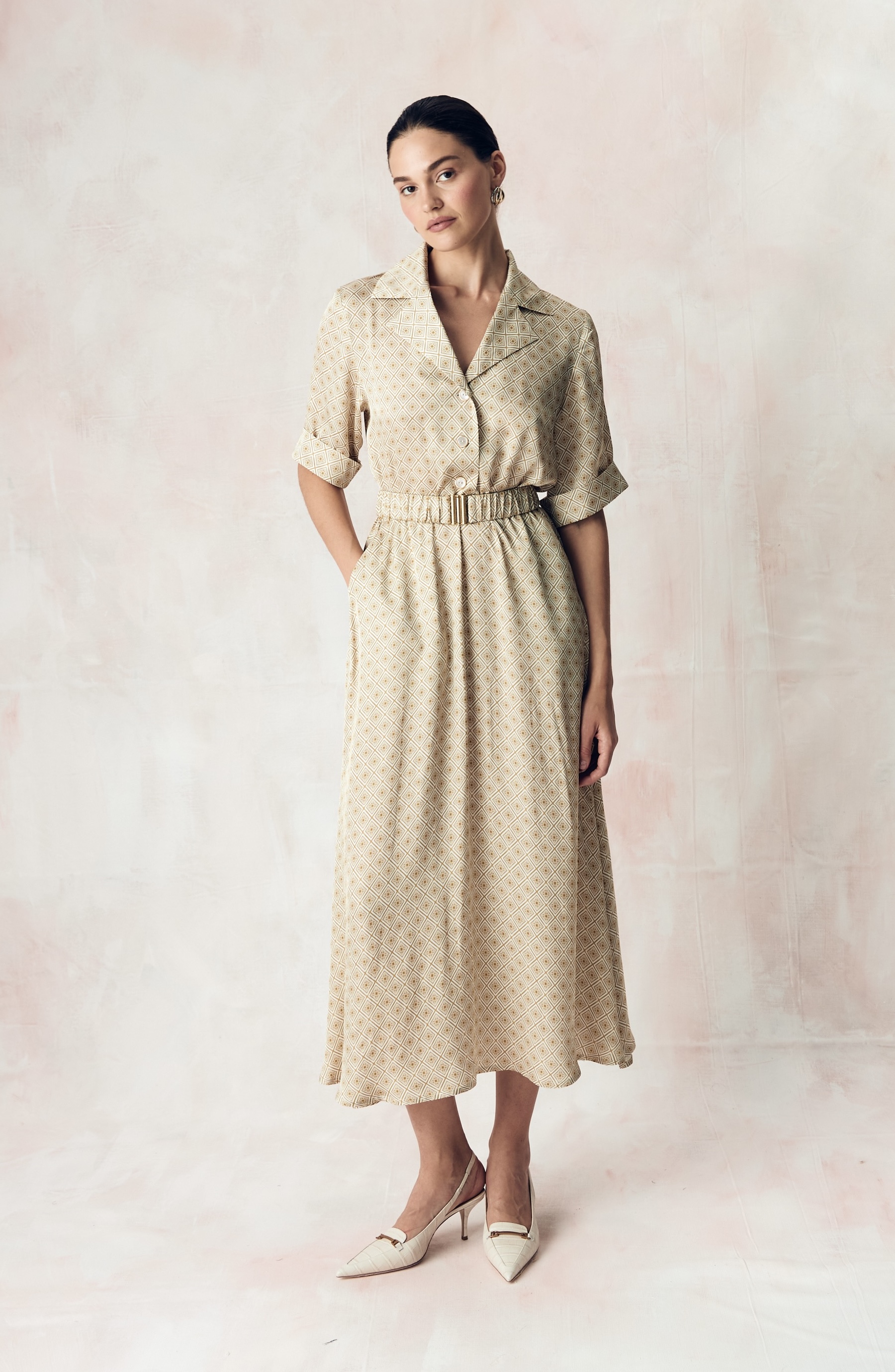 Симметричный ромбовидный орнамент с золотыми виньетками на молочном фоне излучает ауру утонченности и превосходства. Этот принт, вдохновленный эстетикой рококо, завоевывает взгляды своими изящными причудливыми формами, каждый элемент принта создан для того, чтобы подчеркнуть исключительный вкус и статус своей обладательницы.