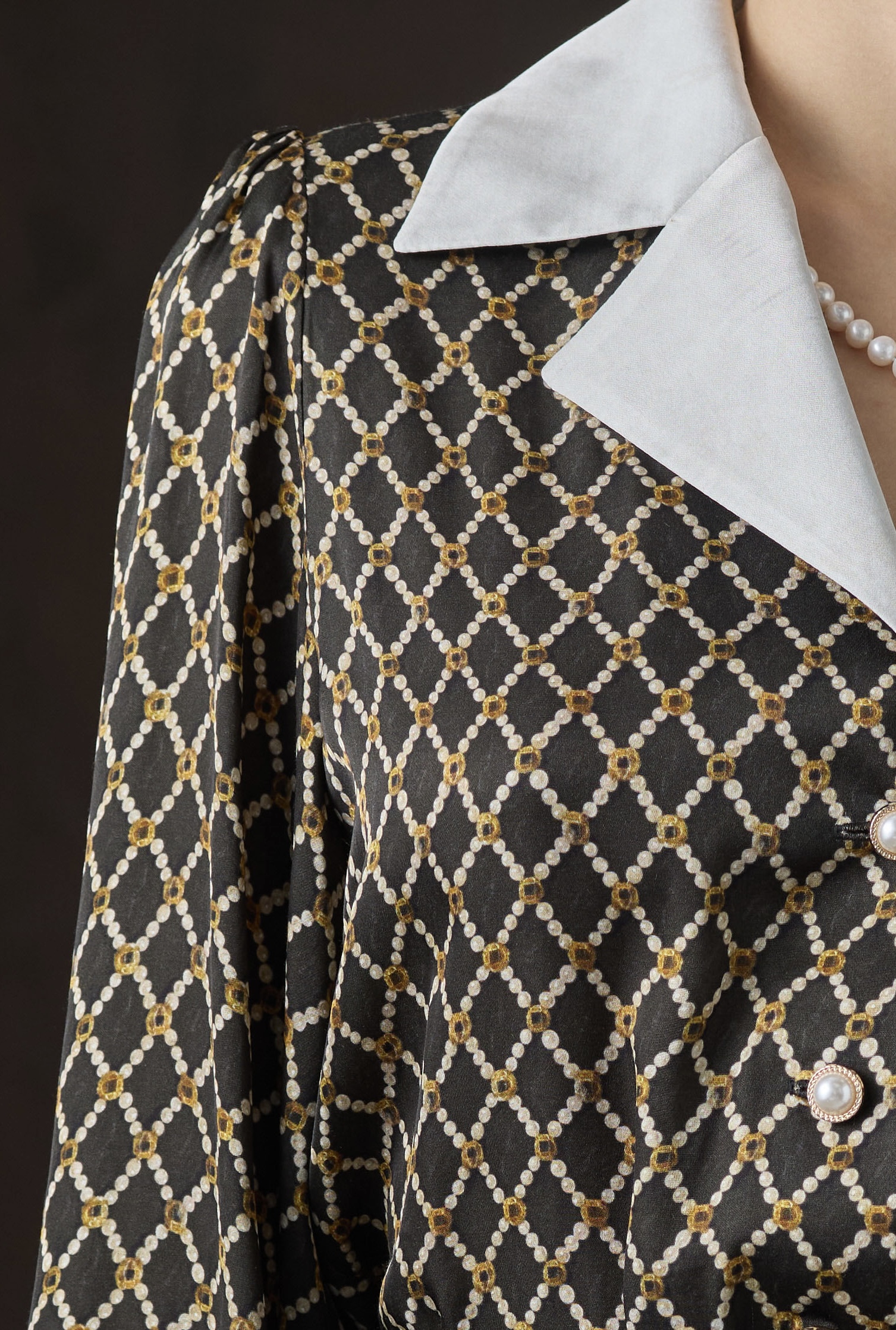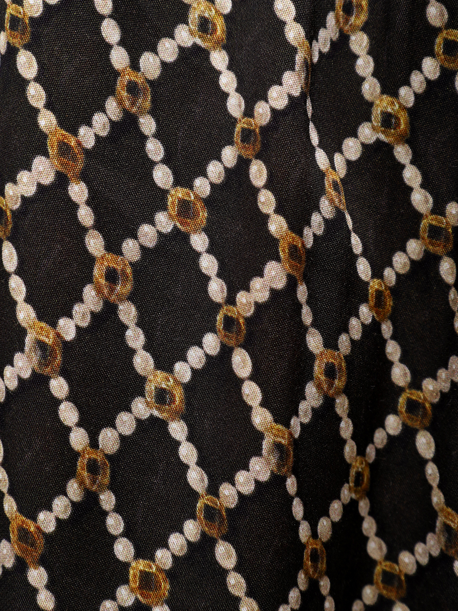 Структурная ромбовидная сетка из жемчужных нитей, с ювелирным декоративным элементом в виде брошки на их переплетении, создает уникальный визуальный акцент. Этот принт рассказывает нам историю о роскоши и изяществе прошлого, вдохновляясь орнаментами из жемчужной сетки на костюмах знати эпохи Просвещения.