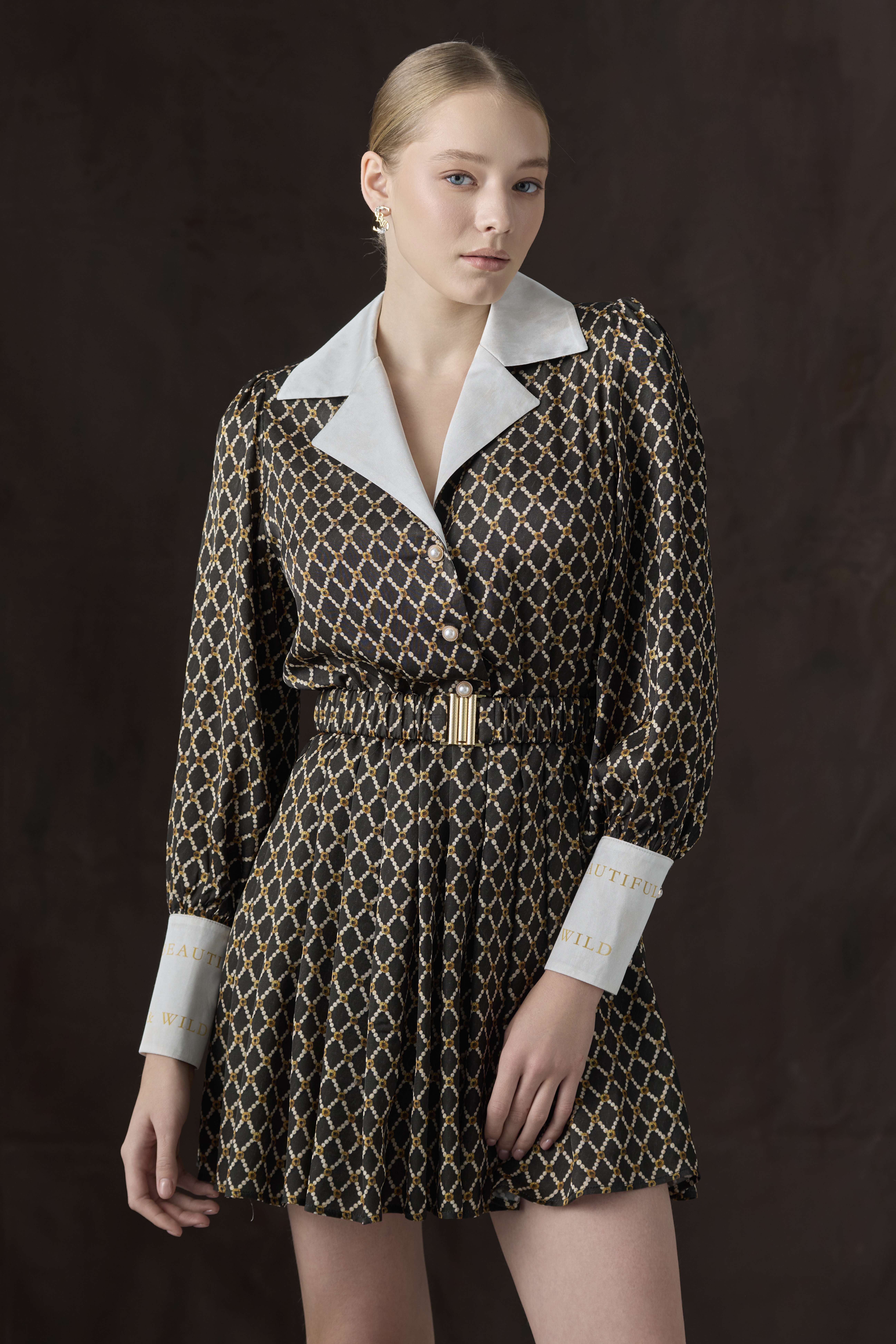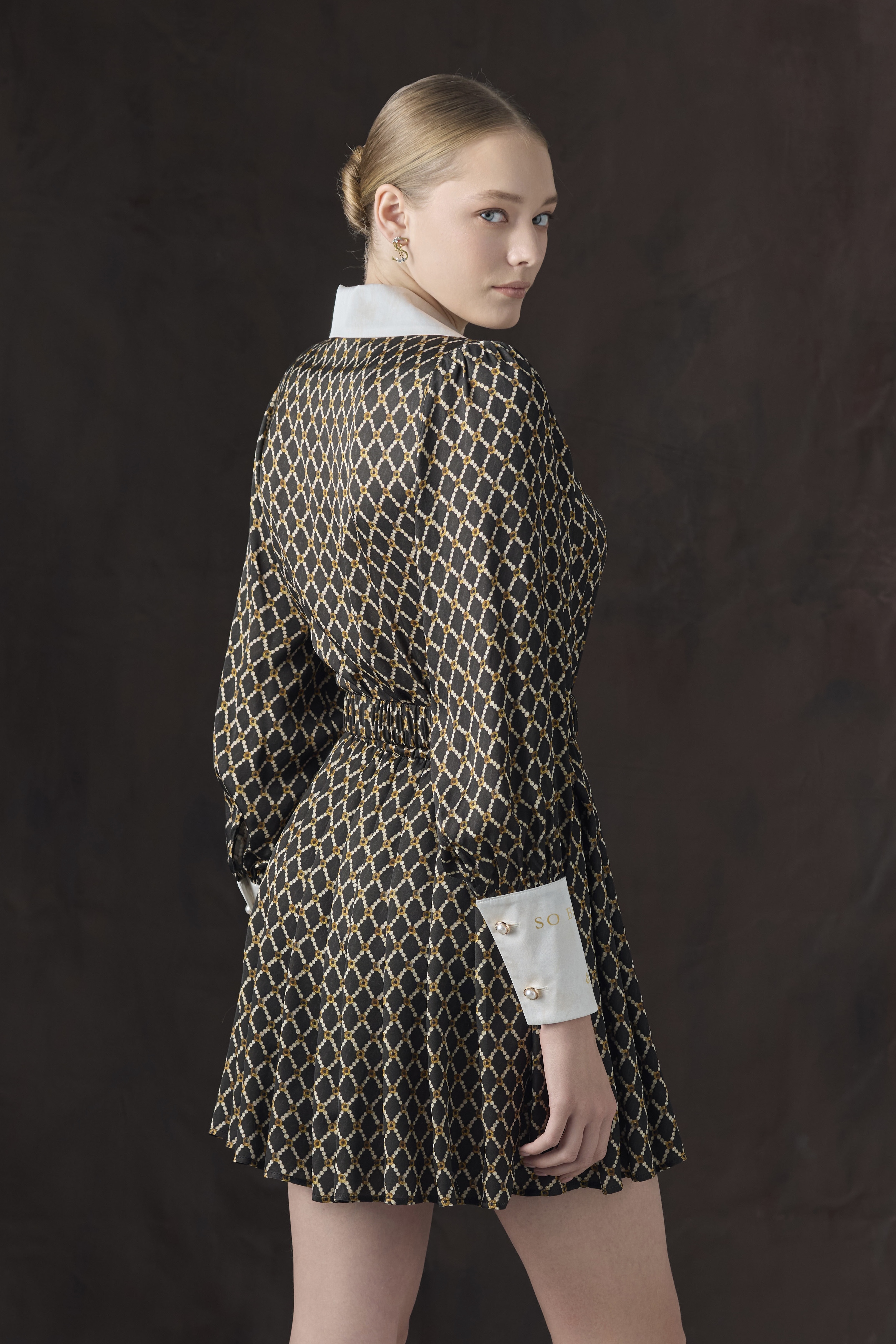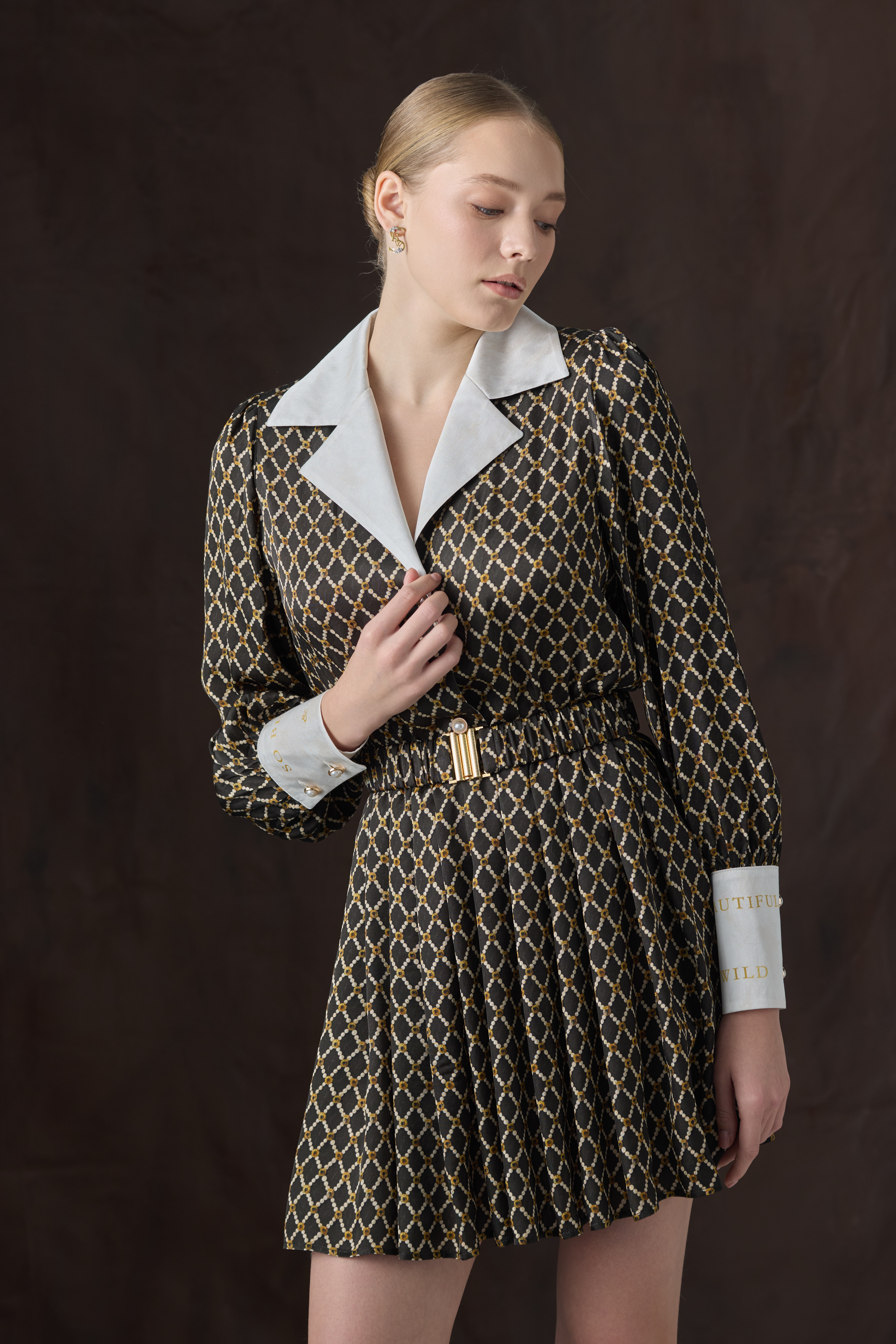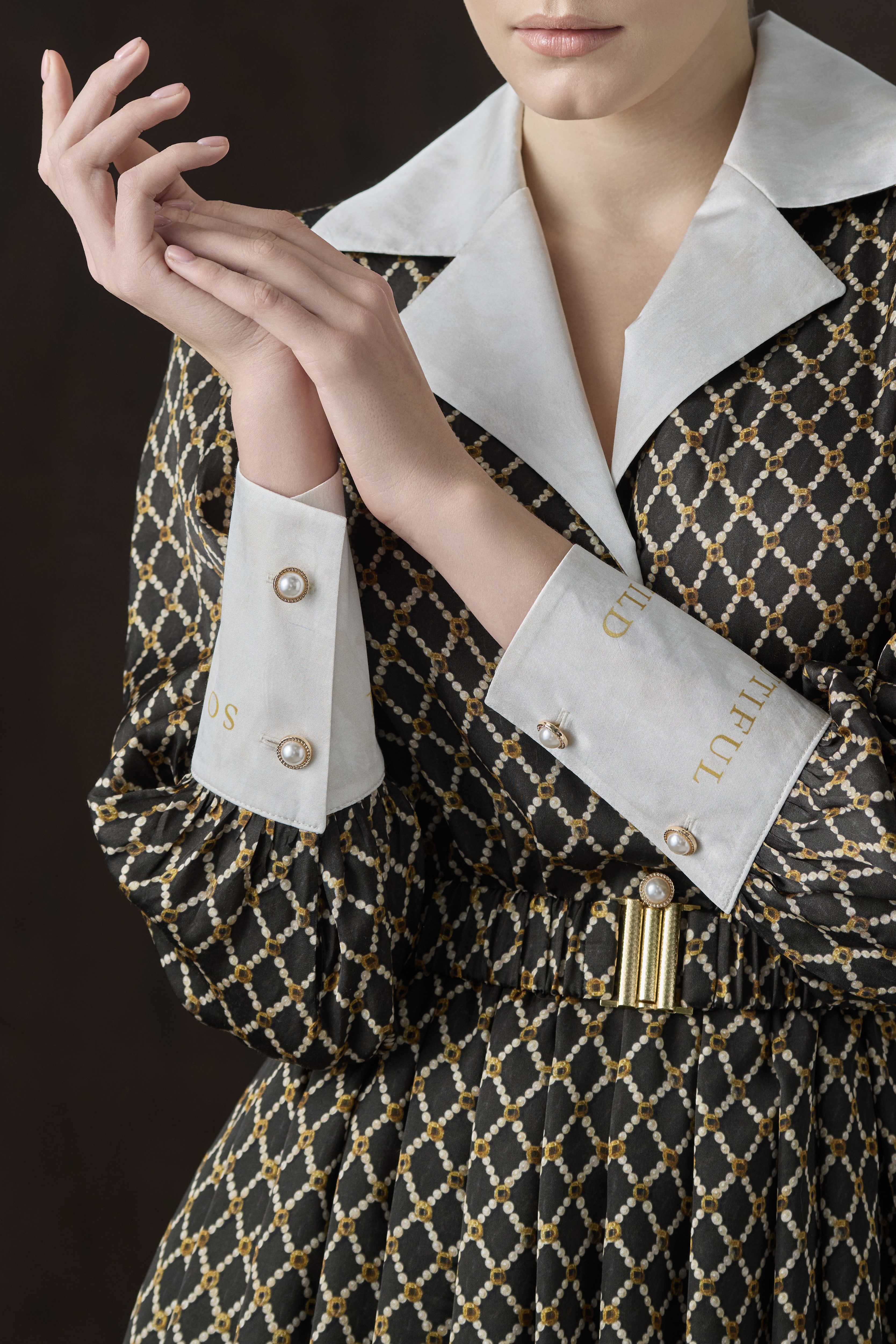 Структурная ромбовидная сетка из жемчужных нитей, с ювелирным декоративным элементом в виде брошки на их переплетении, создает уникальный визуальный акцент. Этот принт рассказывает нам историю о роскоши и изяществе прошлого, вдохновляясь орнаментами из жемчужной сетки на костюмах знати эпохи Просвещения.