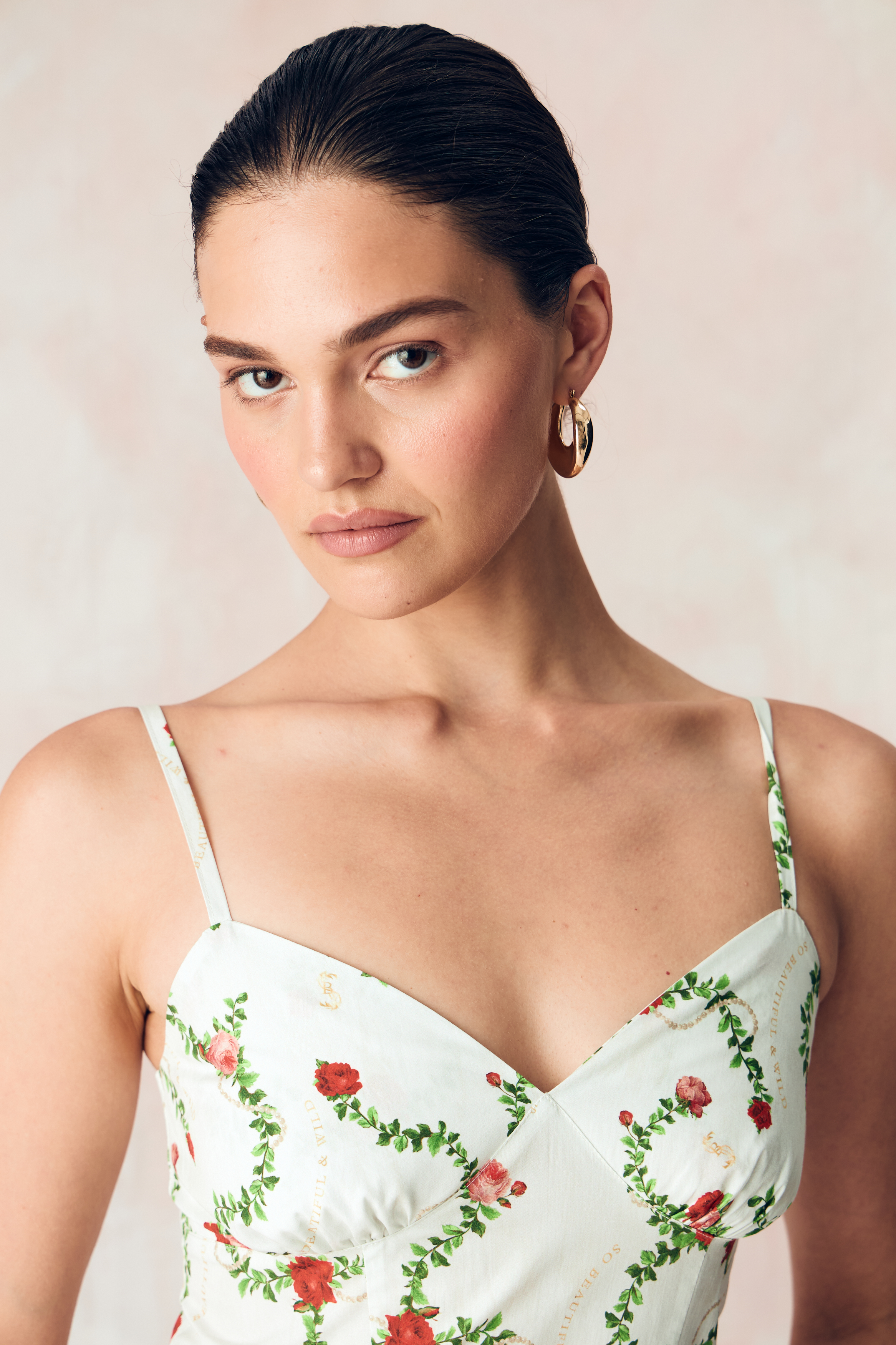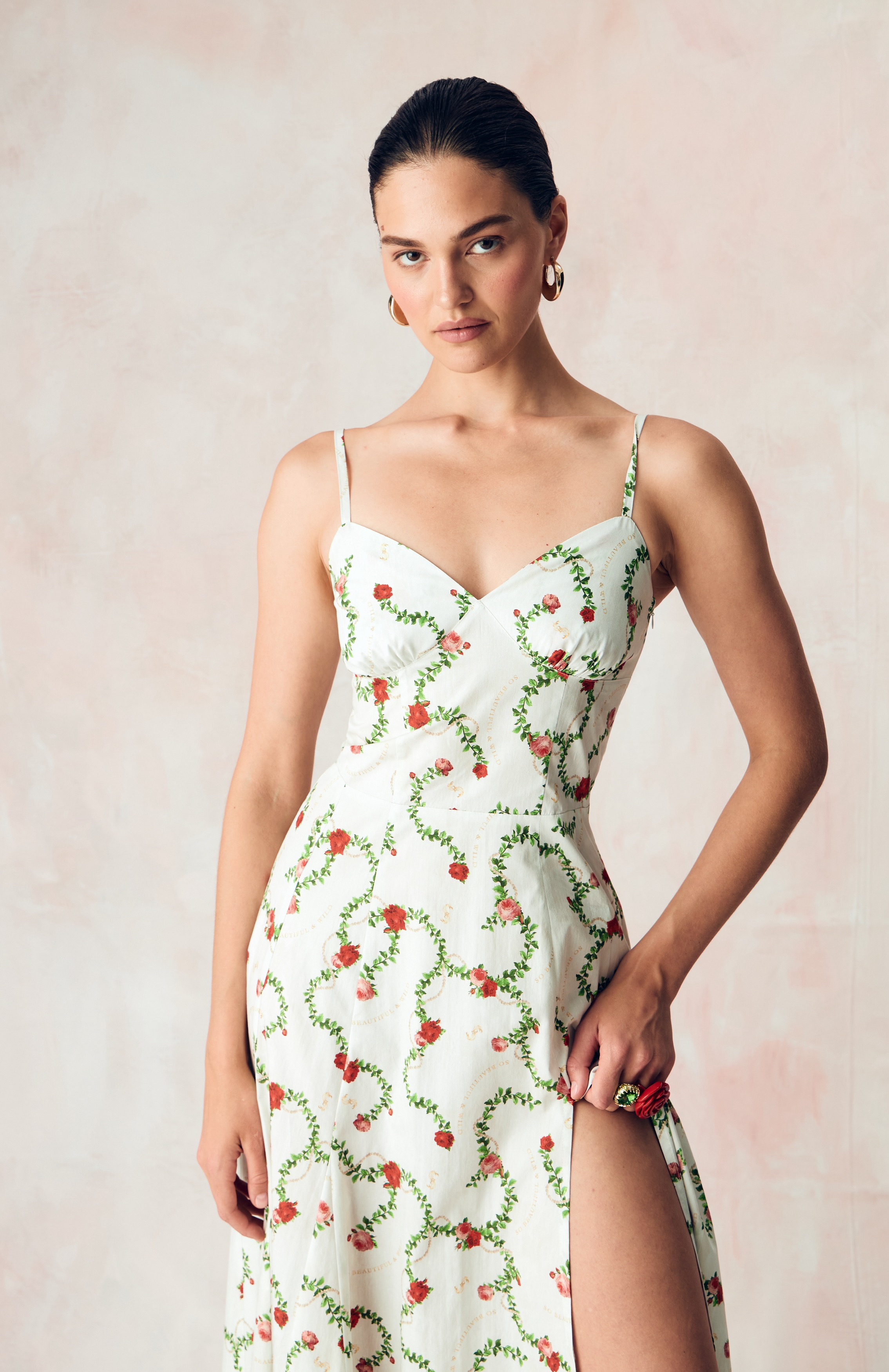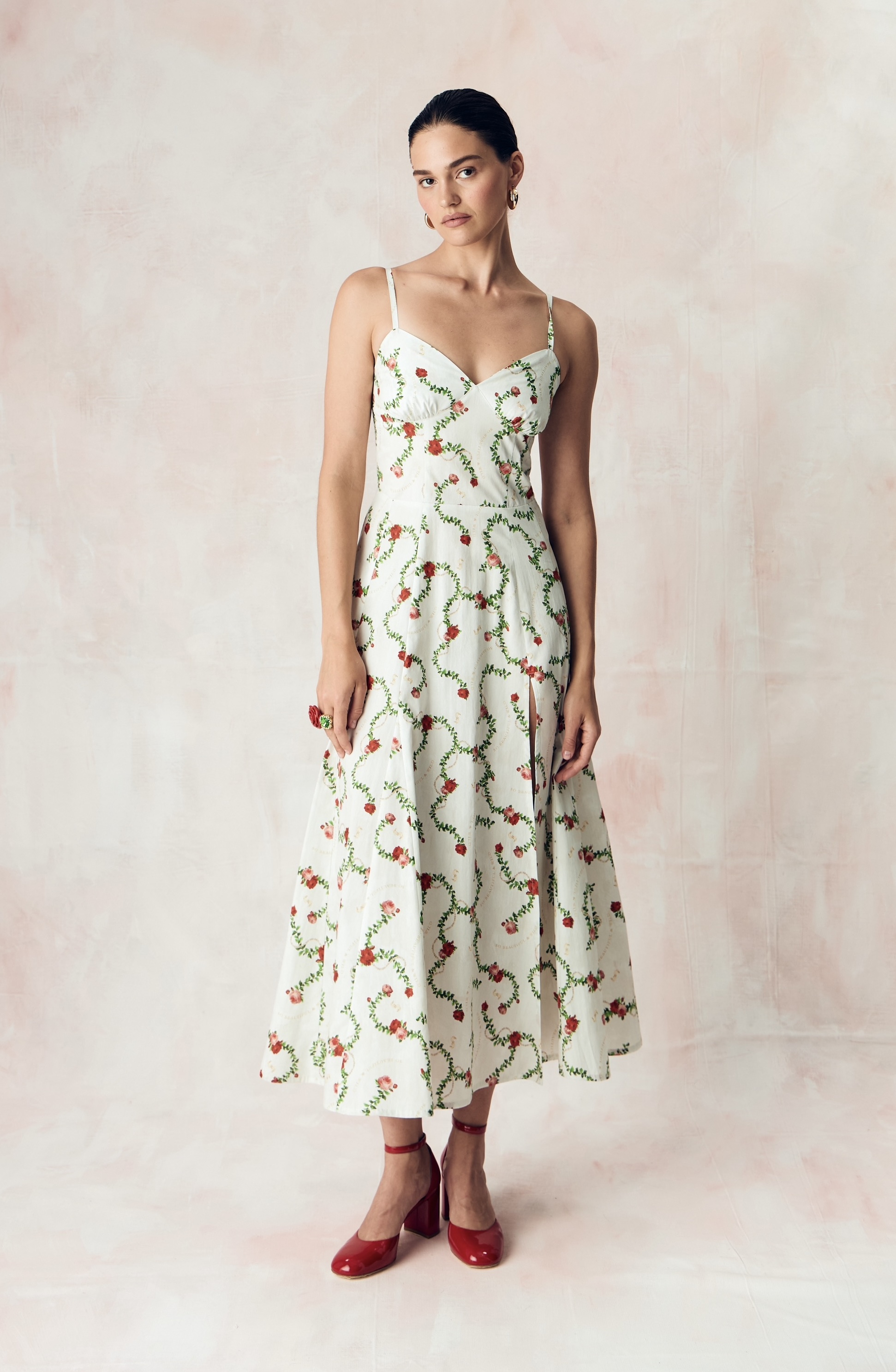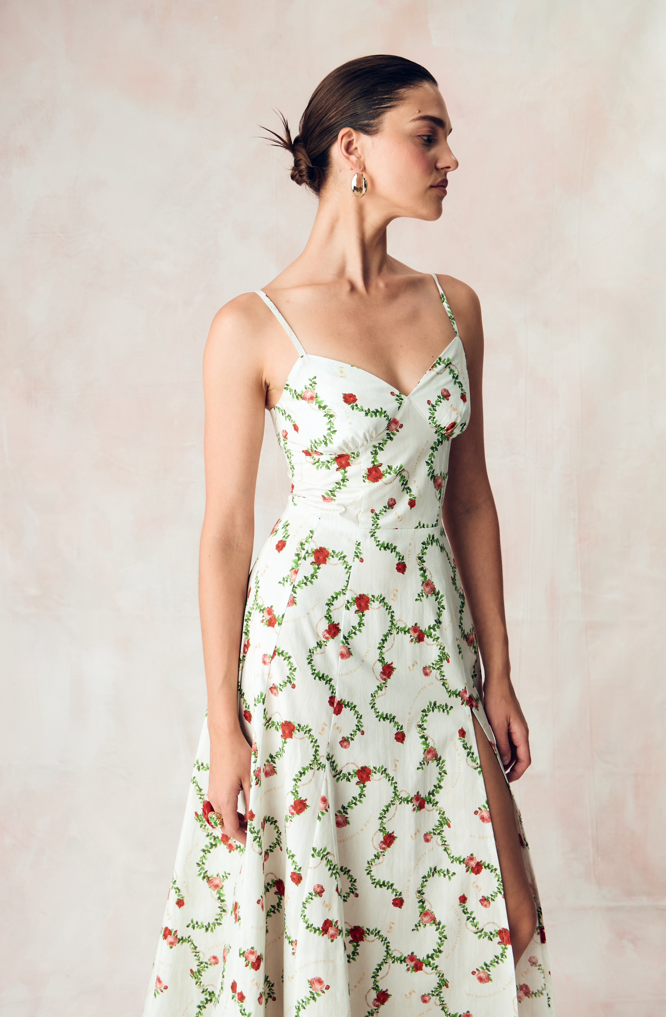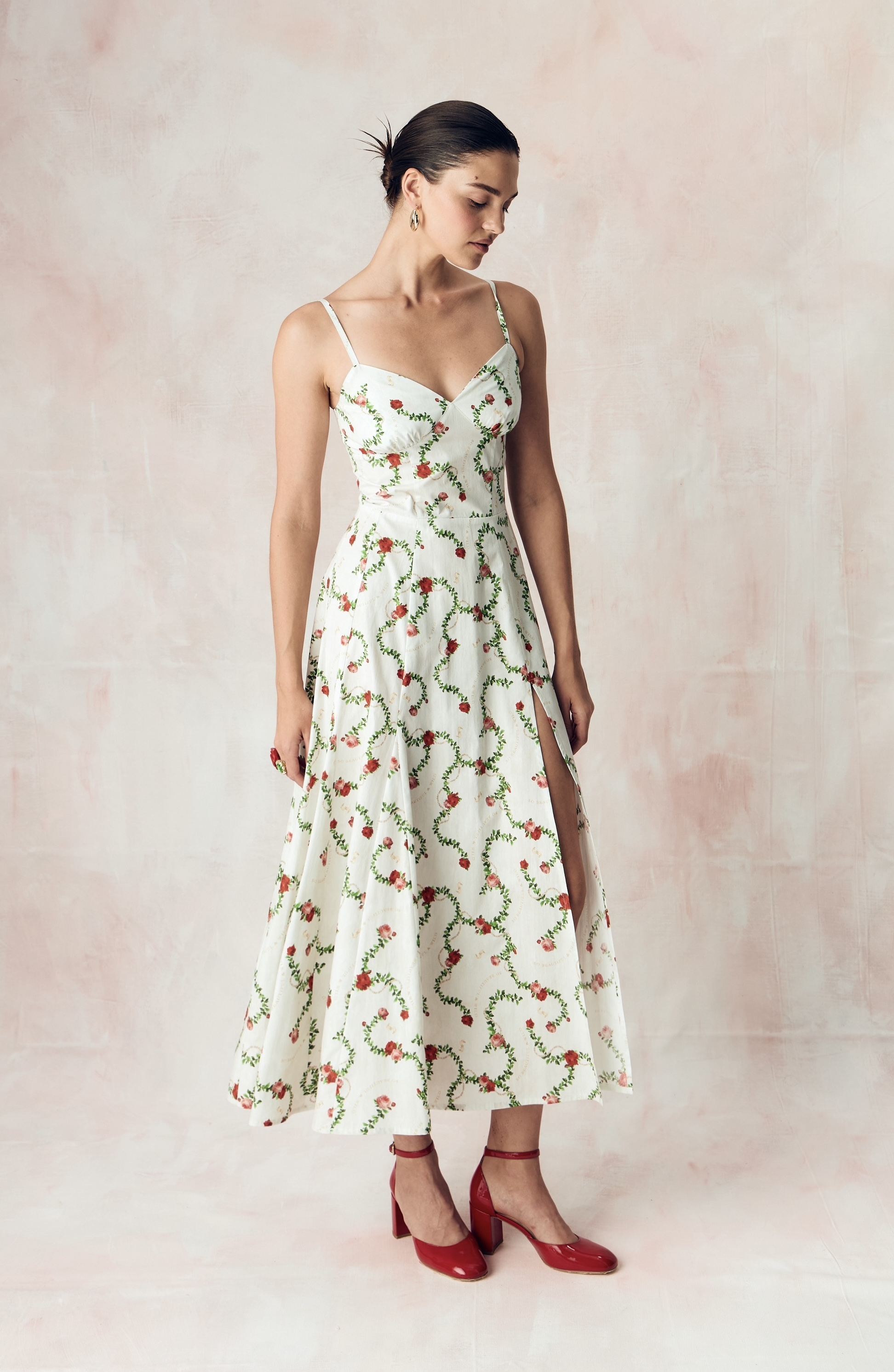 Цветочный узор из бутонов роз нежного розового оттенка переплетается с мерцающей жемчужной нитью на освежающем сливочном фоне. Этот принт вдохновлен платьем Маркизы де Помпадур, фаворитки короля Людовика XV, кисти художника Франсуа Буше. Он отражает атмосферу французской роскоши и романтики XVIII века.