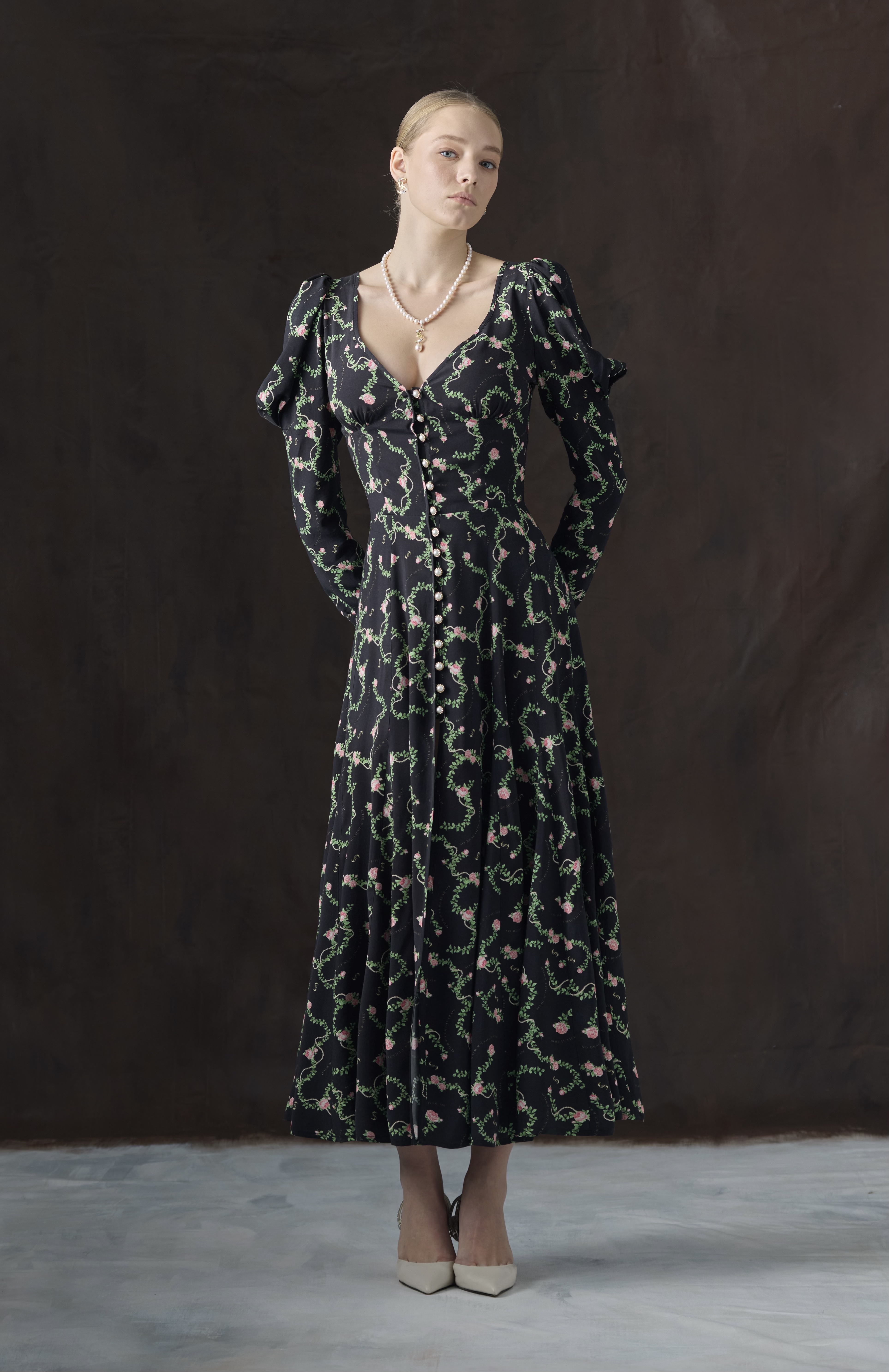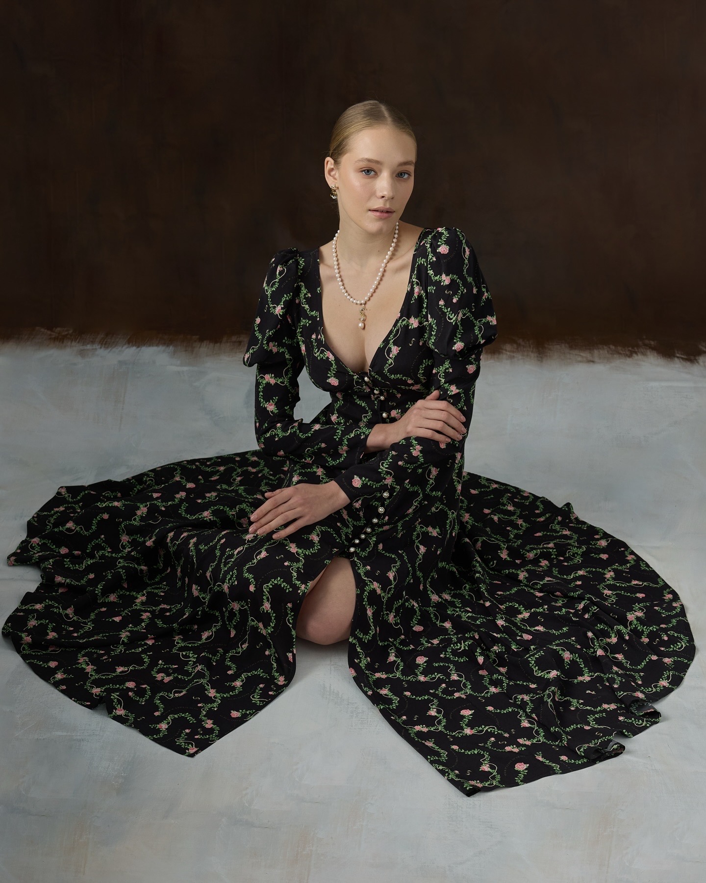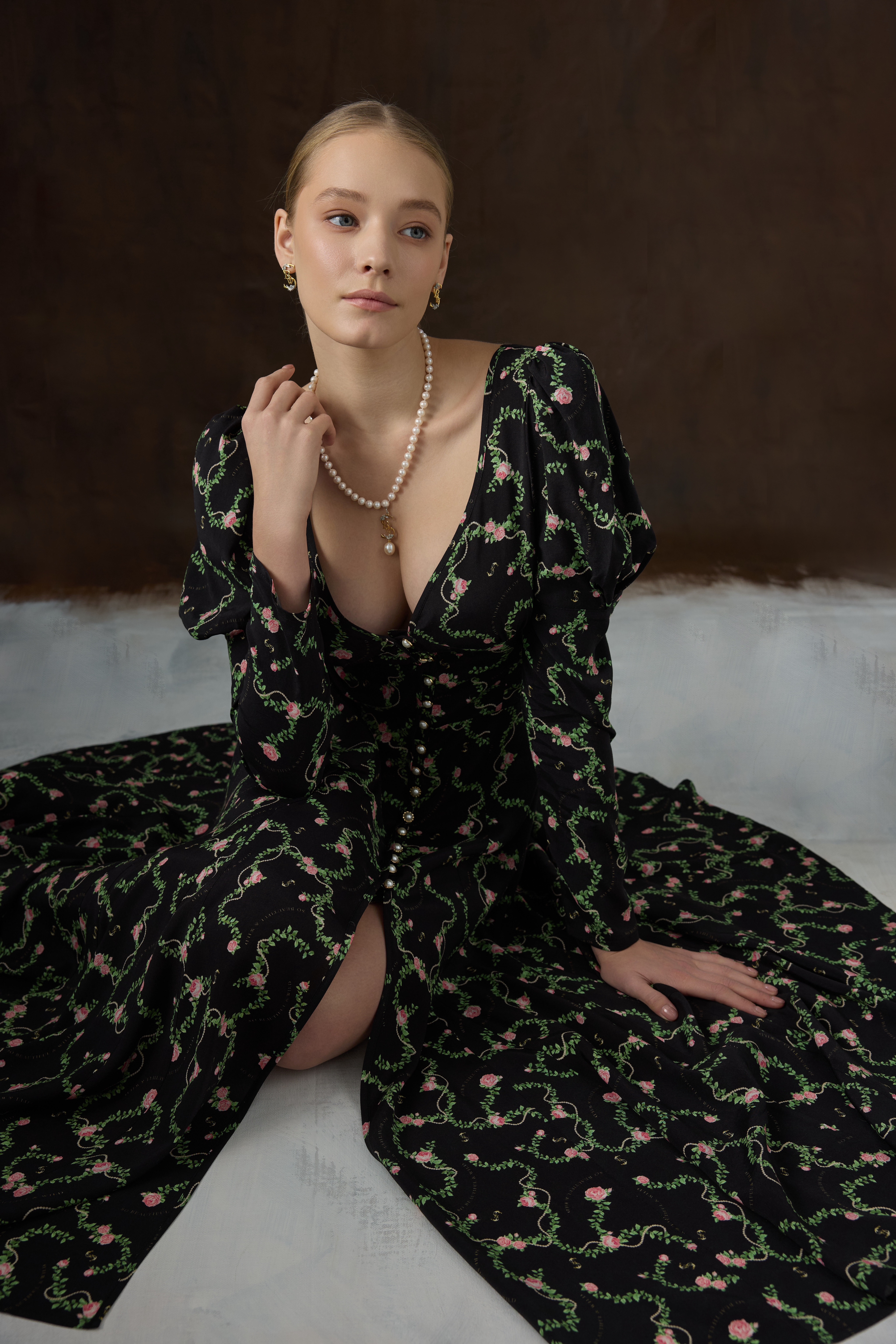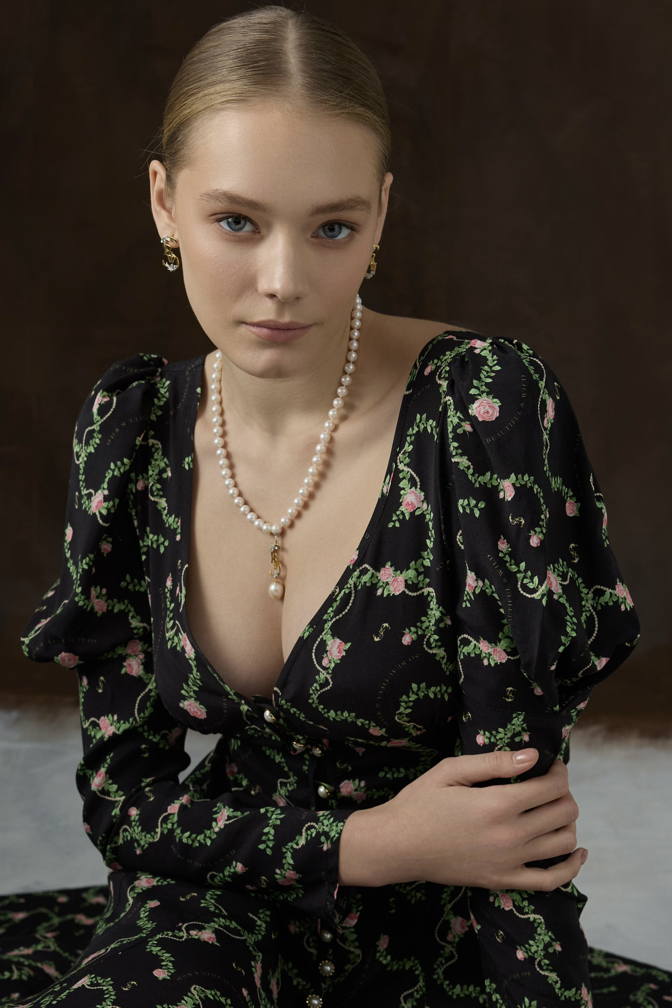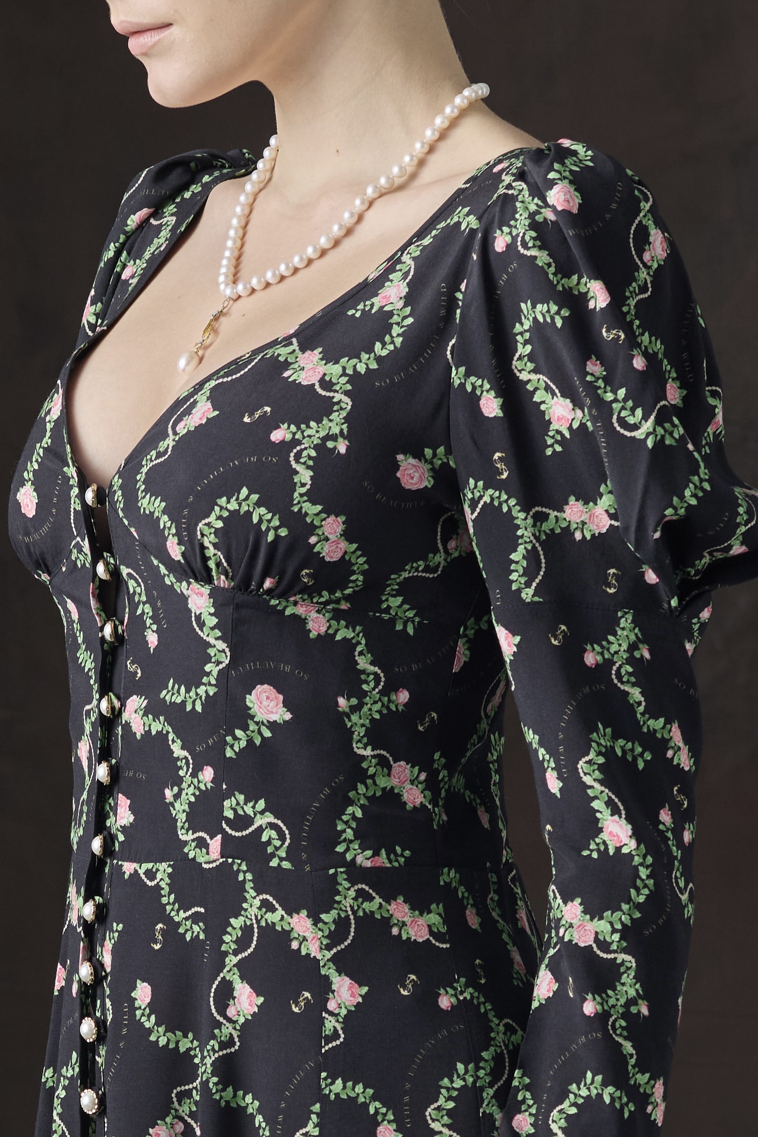 Цветочный узор из бутонов роз нежного розового оттенка переплетается с мерцающей жемчужной нитью на контрастном черном фоне. Этот принт вдохновлен платьем Маркизы де Помпадур, фаворитки короля Людовика XV, кисти художника Франсуа Буше. Он отражает атмосферу французской роскоши и романтики XVIII века.