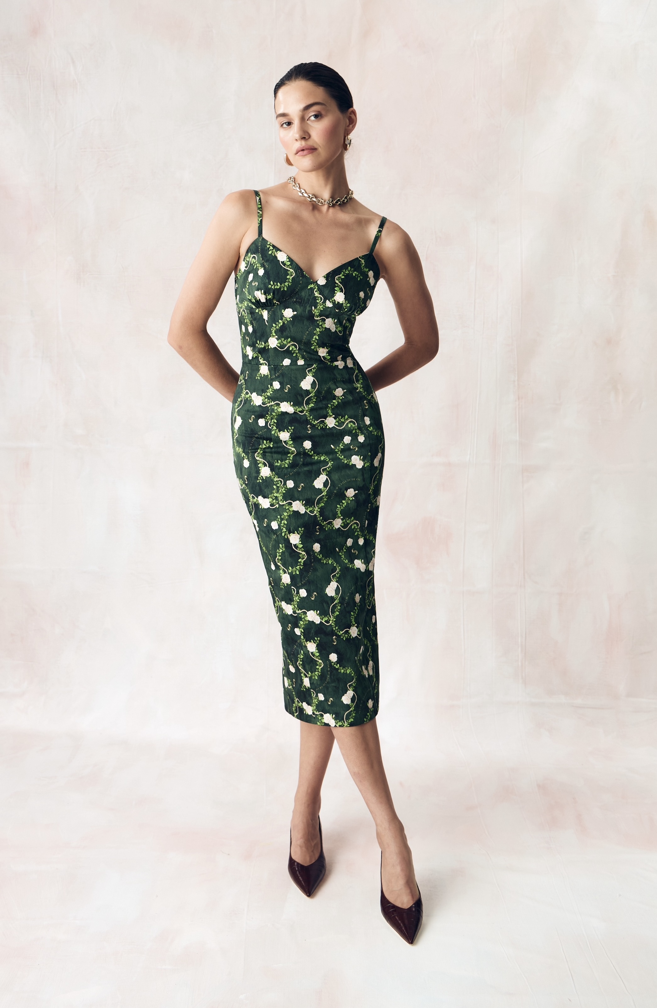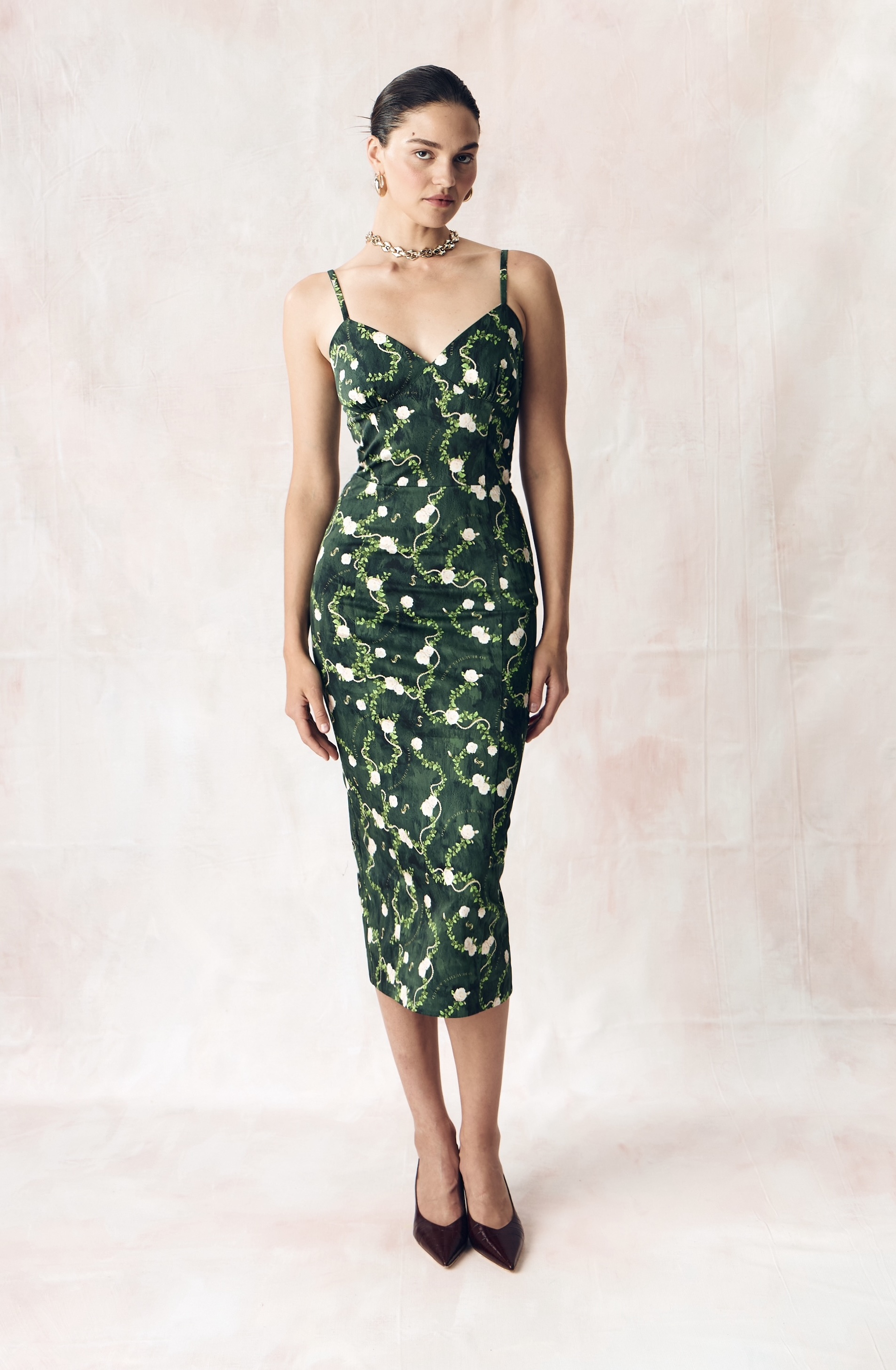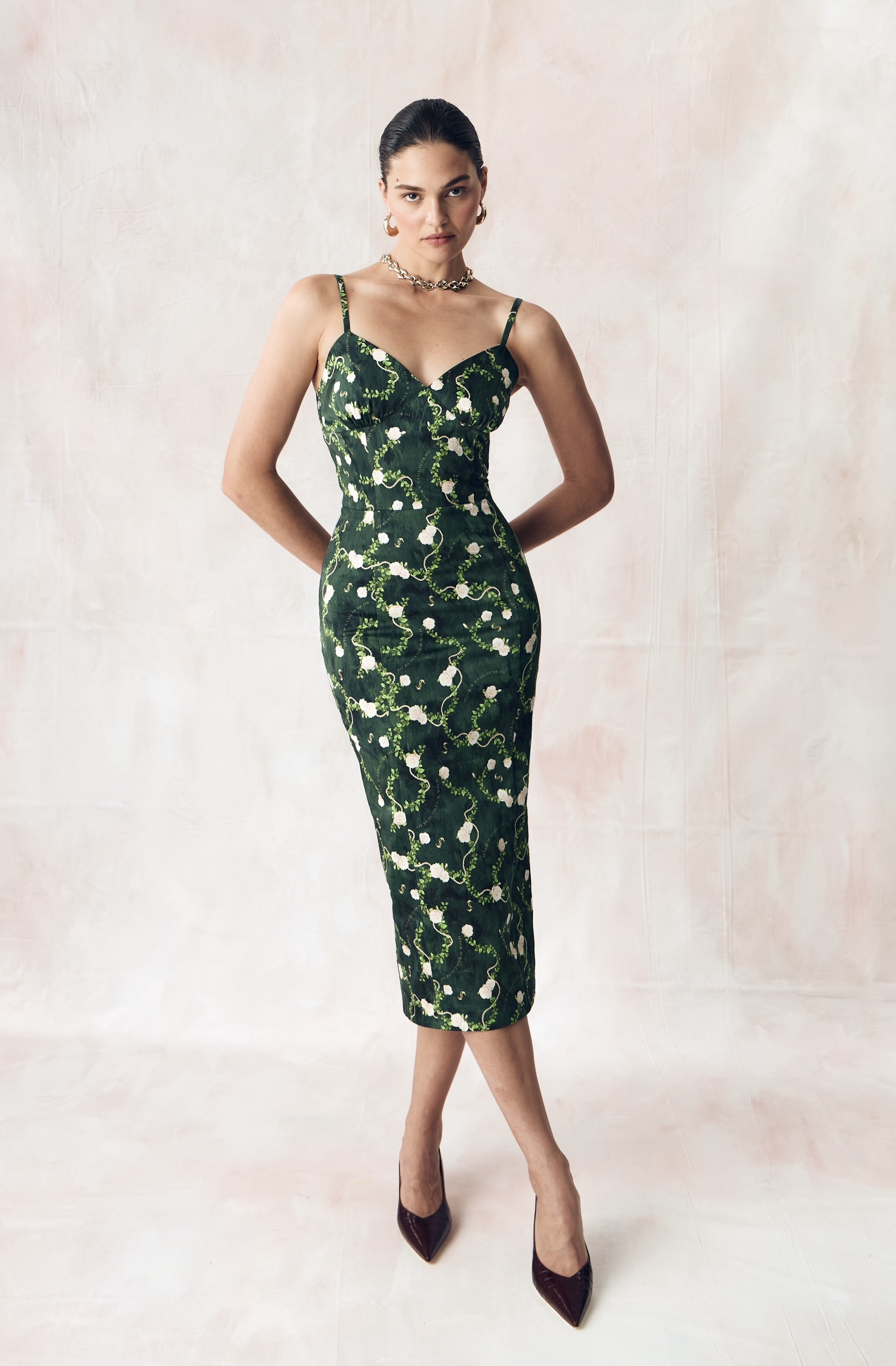 Цветочный узор из бутонов роз нежного сливочного оттенка переплетается с мерцающей жемчужной нитью на глубоком переливающийся изумрудном освежающем фоне. Этот принт вдохновлен платьем Маркизы де Помпадур, фаворитки короля Людовика XV, кисти художника Франсуа Буше. Он отражает атмосферу французской роскоши и романтики XVIII века.