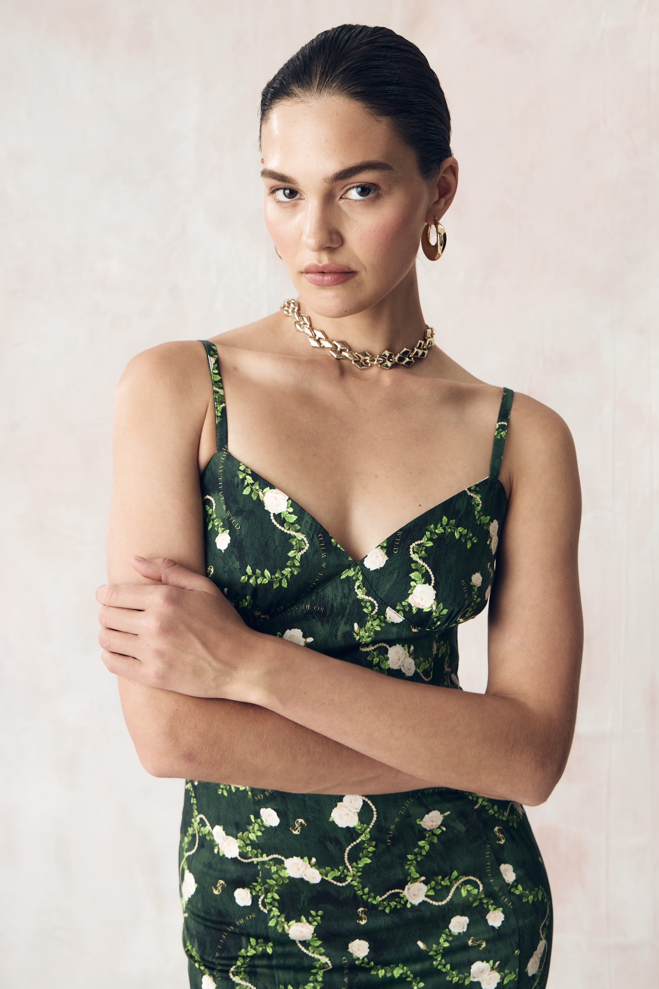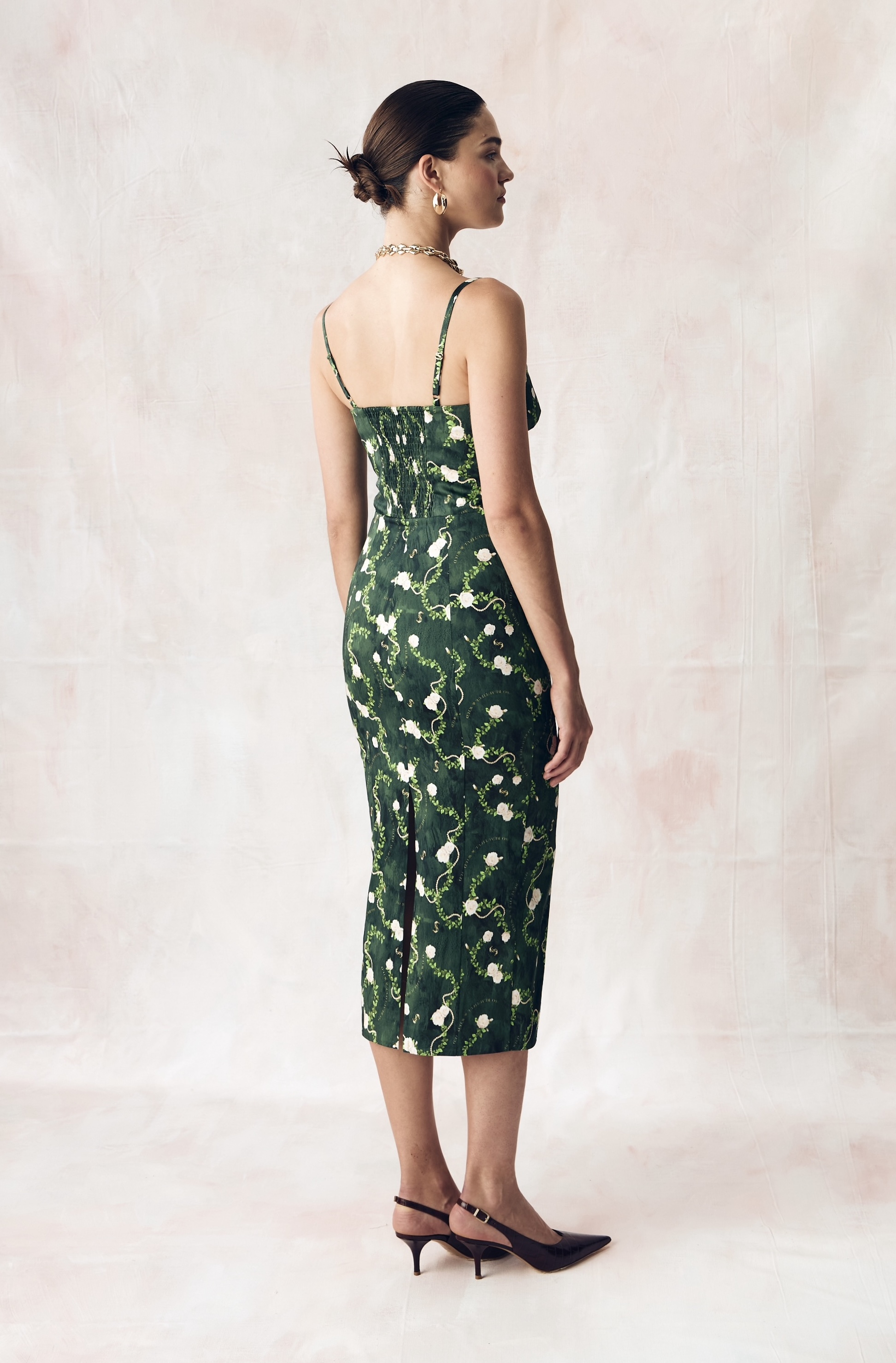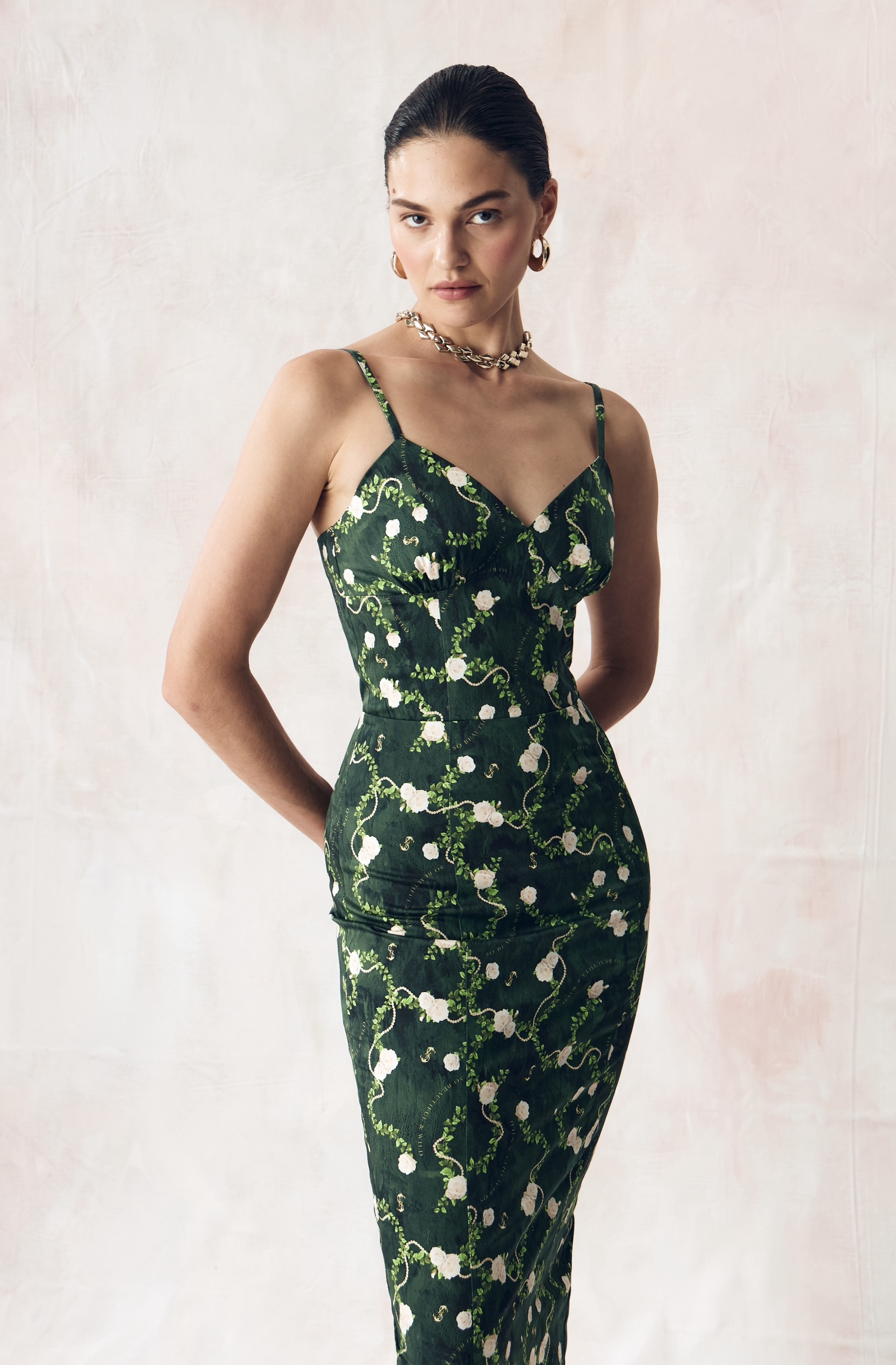 Цветочный узор из бутонов роз нежного сливочного оттенка переплетается с мерцающей жемчужной нитью на глубоком переливающийся изумрудном освежающем фоне. Этот принт вдохновлен платьем Маркизы де Помпадур, фаворитки короля Людовика XV, кисти художника Франсуа Буше. Он отражает атмосферу французской роскоши и романтики XVIII века.