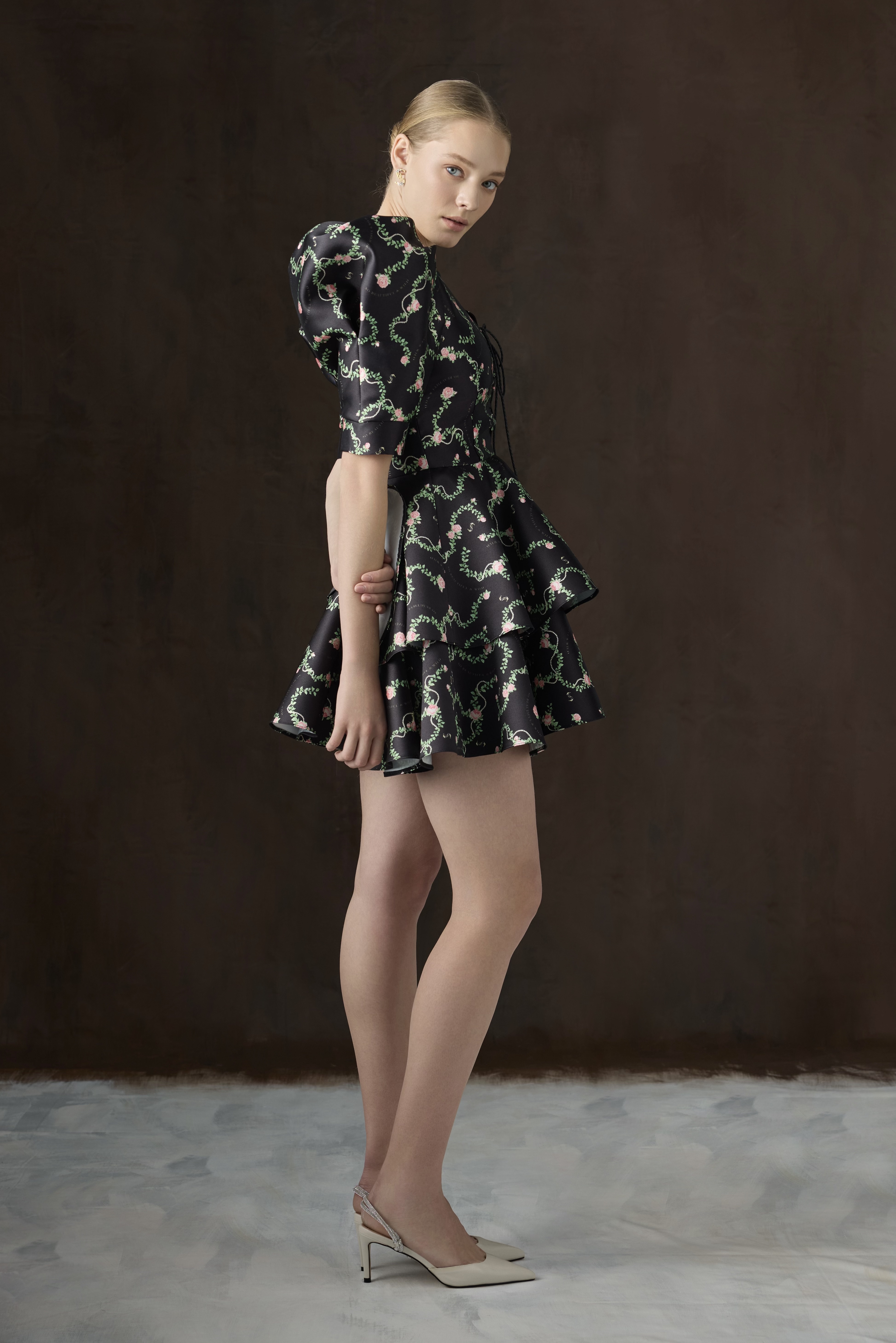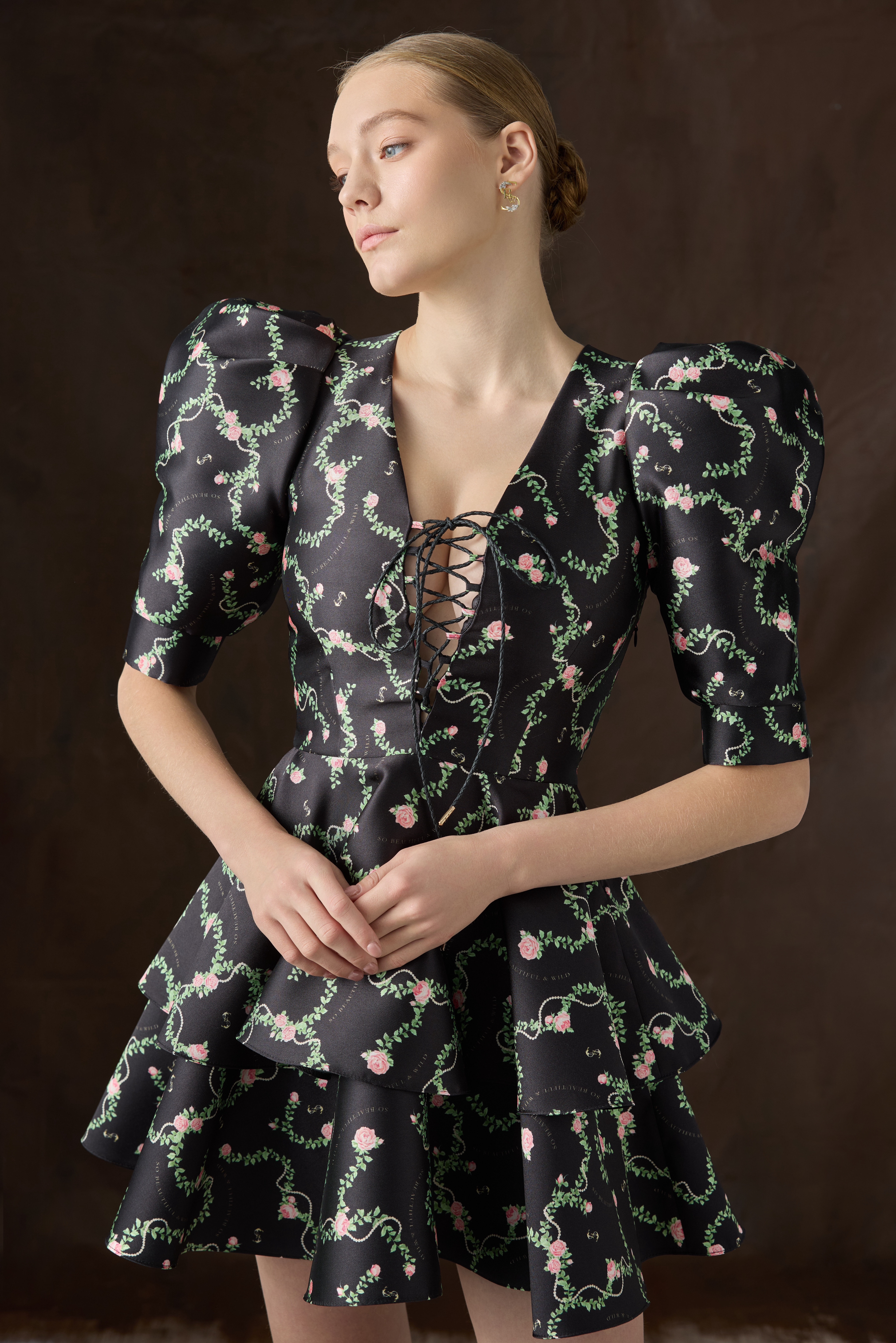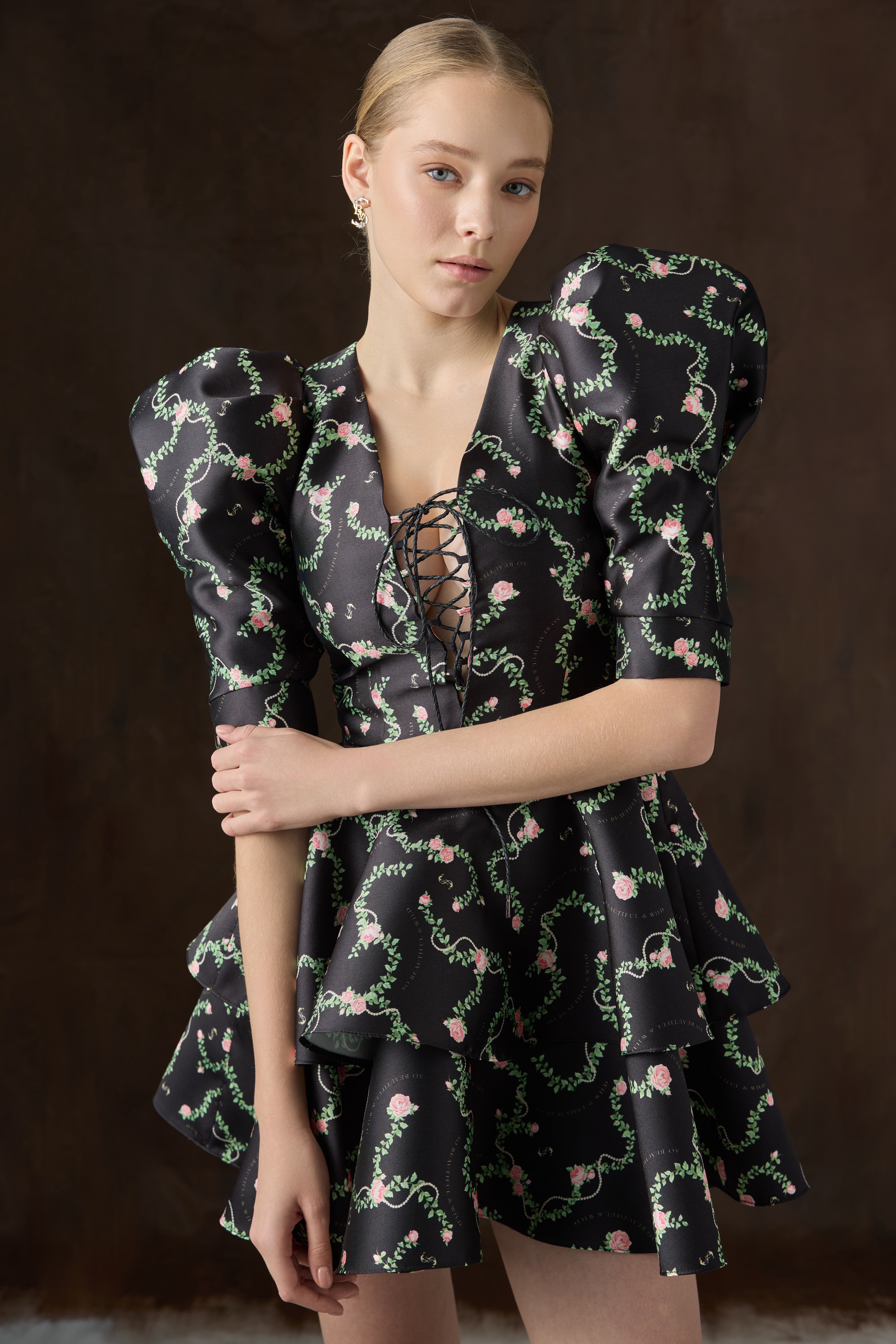 Цветочный узор из бутонов роз нежного розового оттенка переплетается с мерцающей жемчужной нитью на контрастном черном фоне. Этот принт вдохновлен платьем Маркизы де Помпадур, фаворитки короля Людовика XV, кисти художника Франсуа Буше. Он отражает атмосферу французской роскоши и романтики XVIII века.