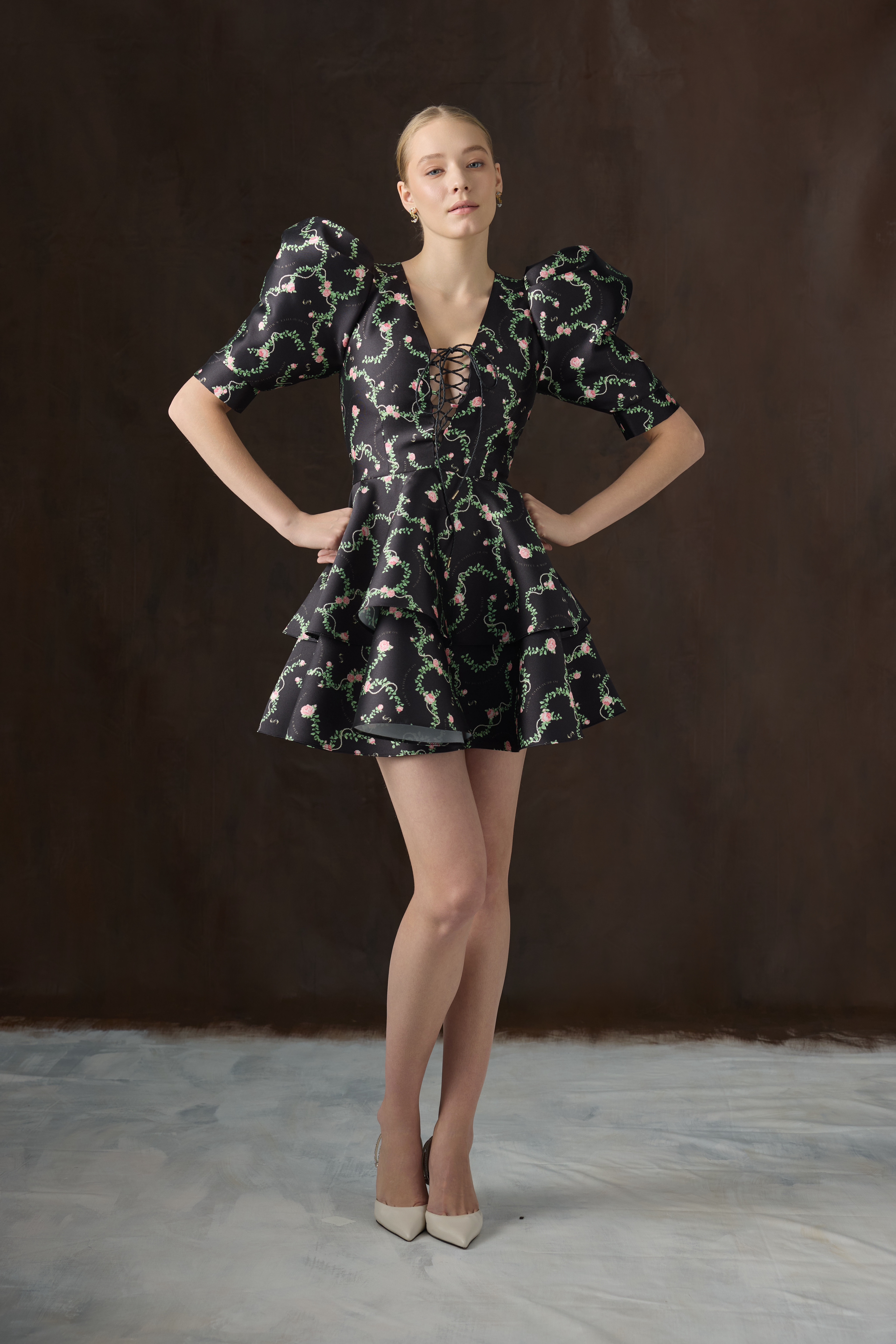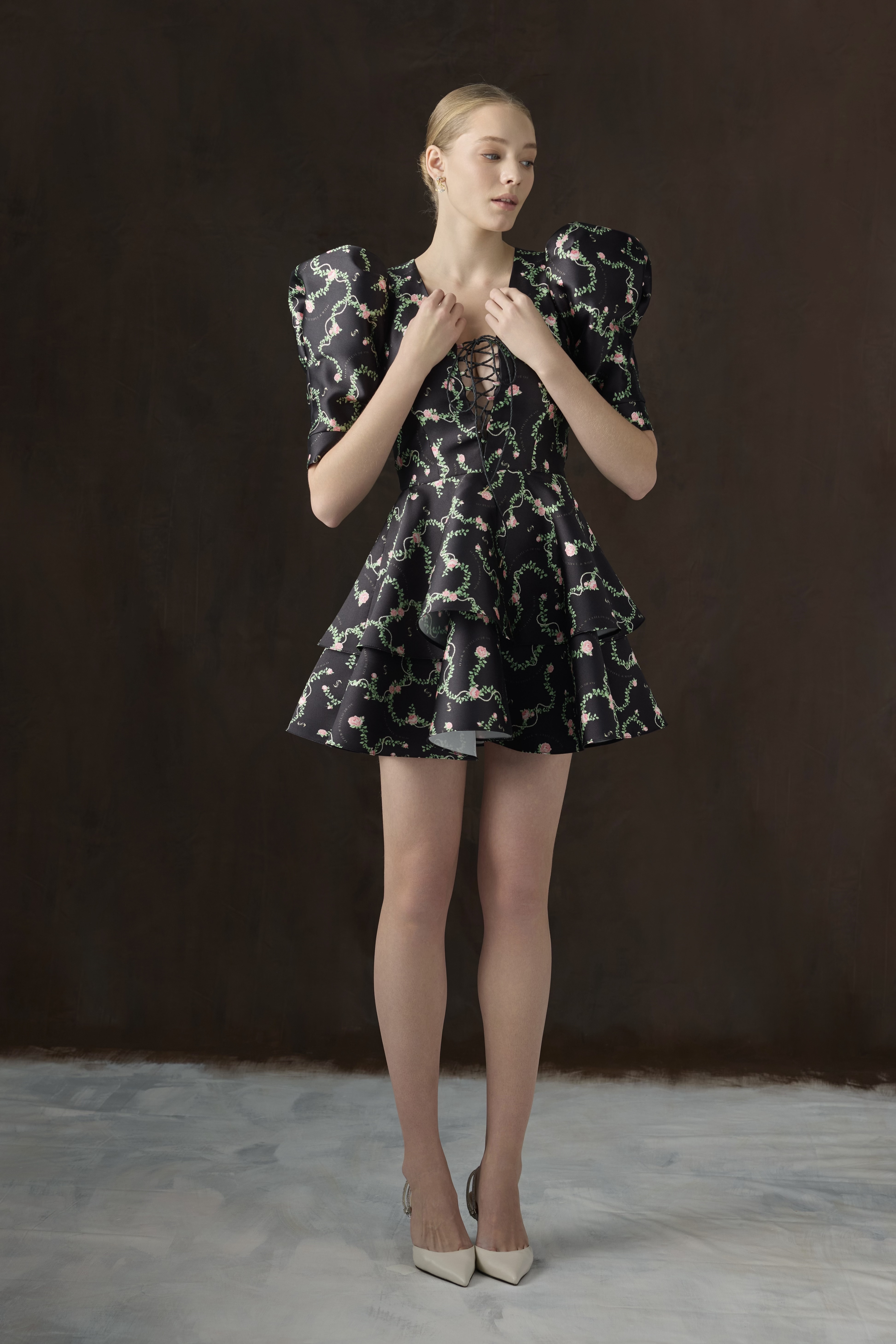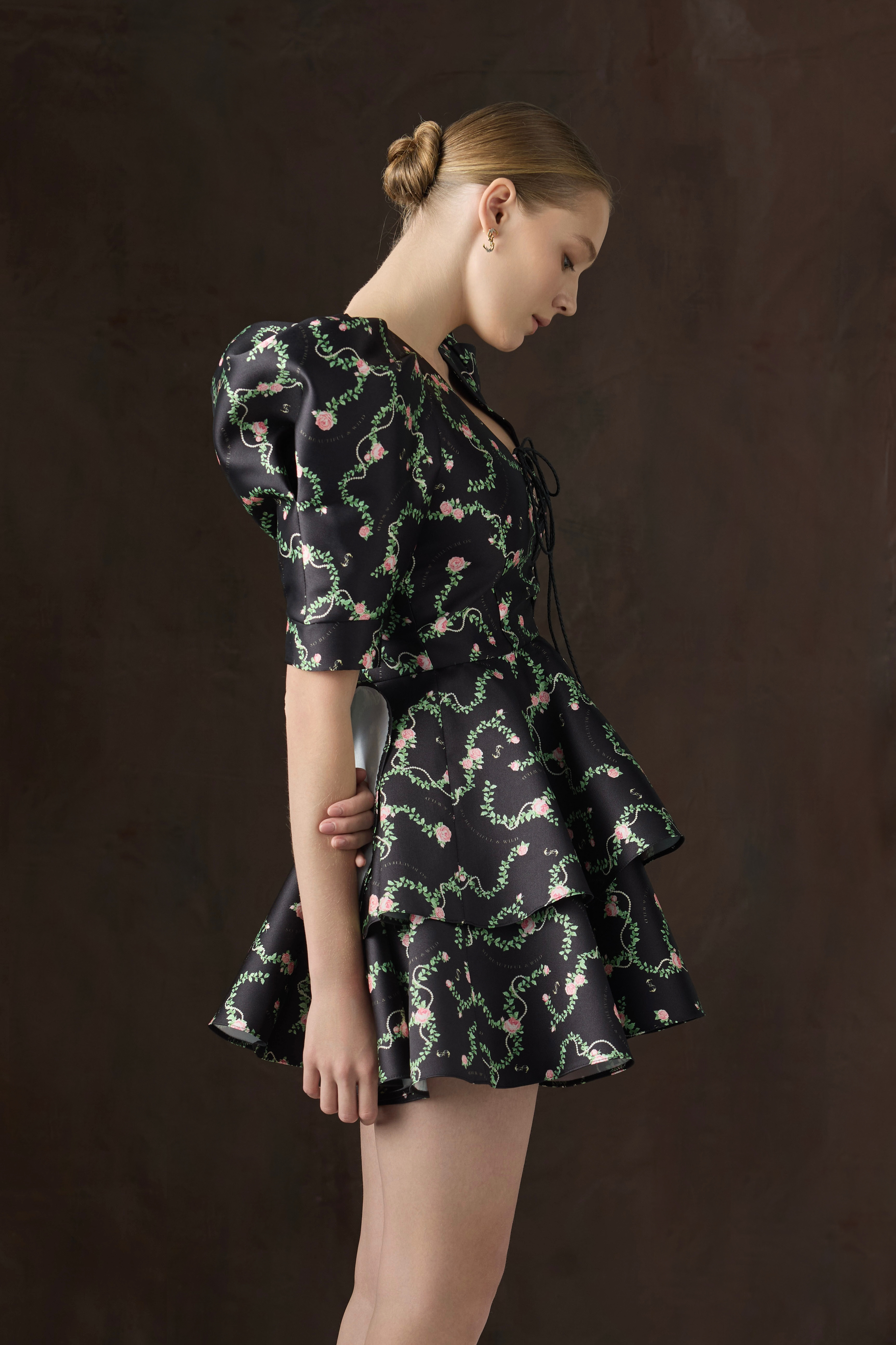 Цветочный узор из бутонов роз нежного розового оттенка переплетается с мерцающей жемчужной нитью на контрастном черном фоне. Этот принт вдохновлен платьем Маркизы де Помпадур, фаворитки короля Людовика XV, кисти художника Франсуа Буше. Он отражает атмосферу французской роскоши и романтики XVIII века.