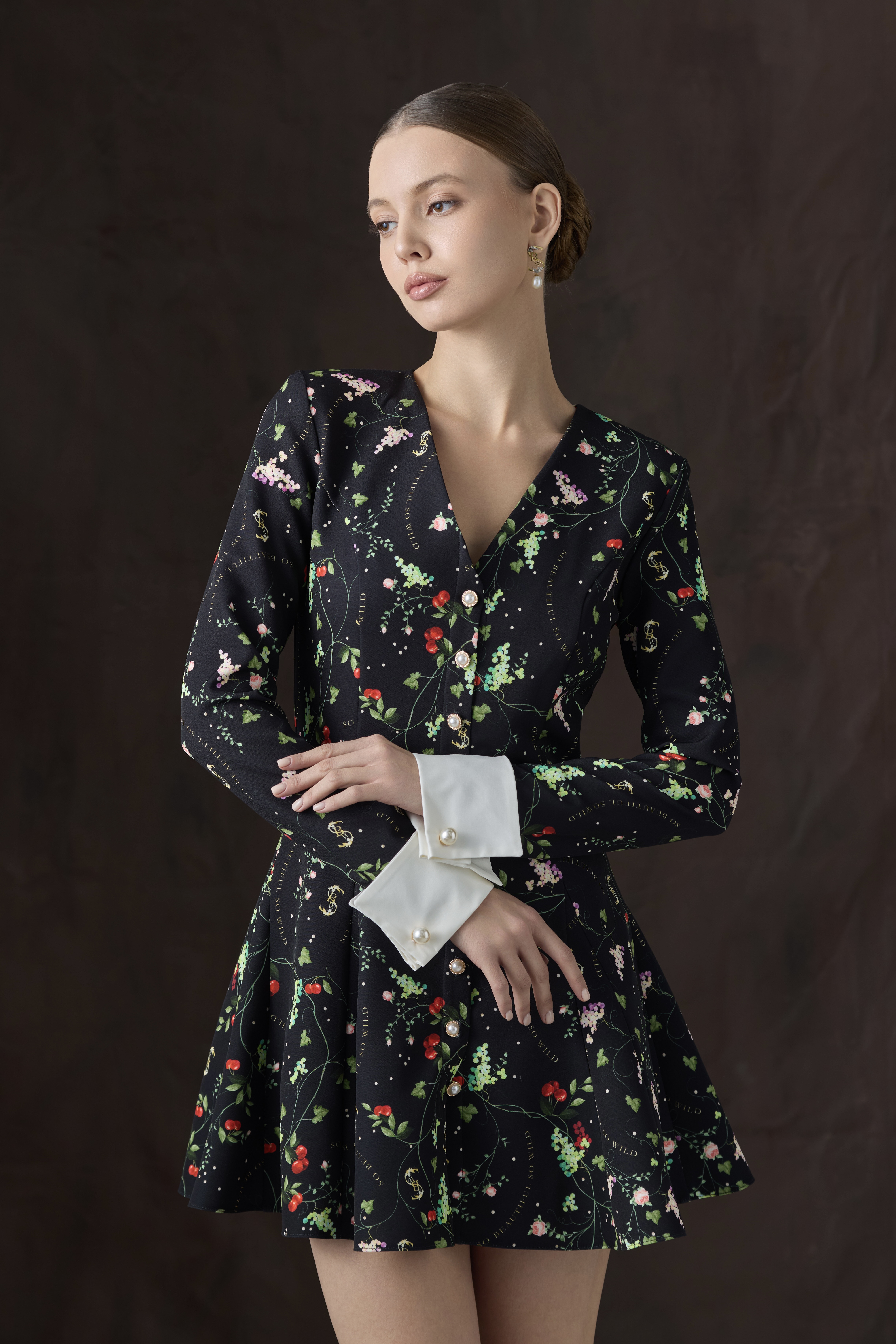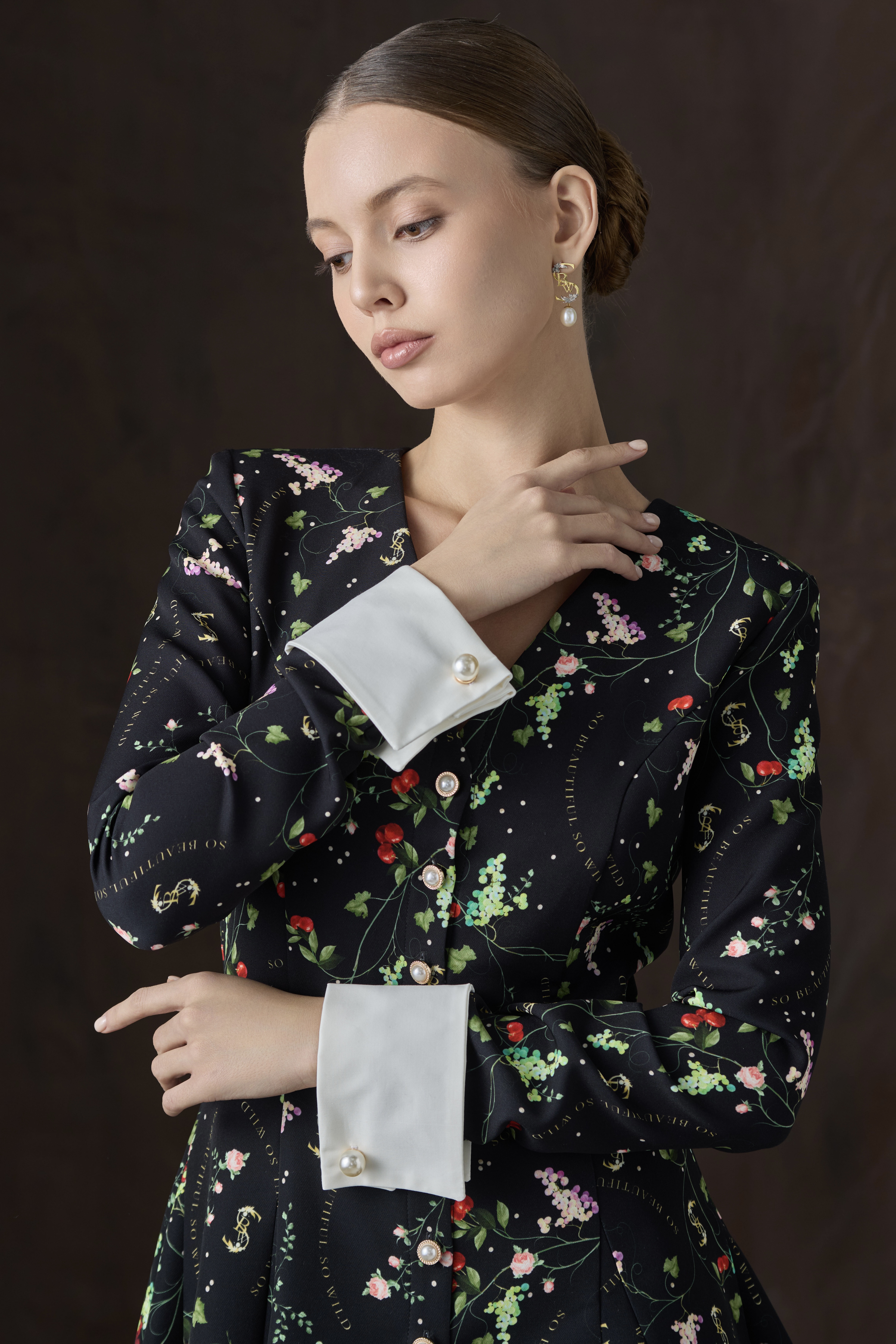 Растительная композиция на глубоком черном фоне, украшенная изящными ветвями виноградной лозы и кустовыми розами с миниатюрными соцветиями, представляет собой гармоничное сочетание нежности и утонченности. Виноградные грозди сложных оттенков, превосходно оттеняющие вишневые цветы и ягоды, создают статусный и одновременно изящный образ. Тонкий золотой шрифт с названием бренда SO BEAUTIFUL&WILD обрамляет этот изысканный рисунок, акцентируя индивидуальность наших героинь.