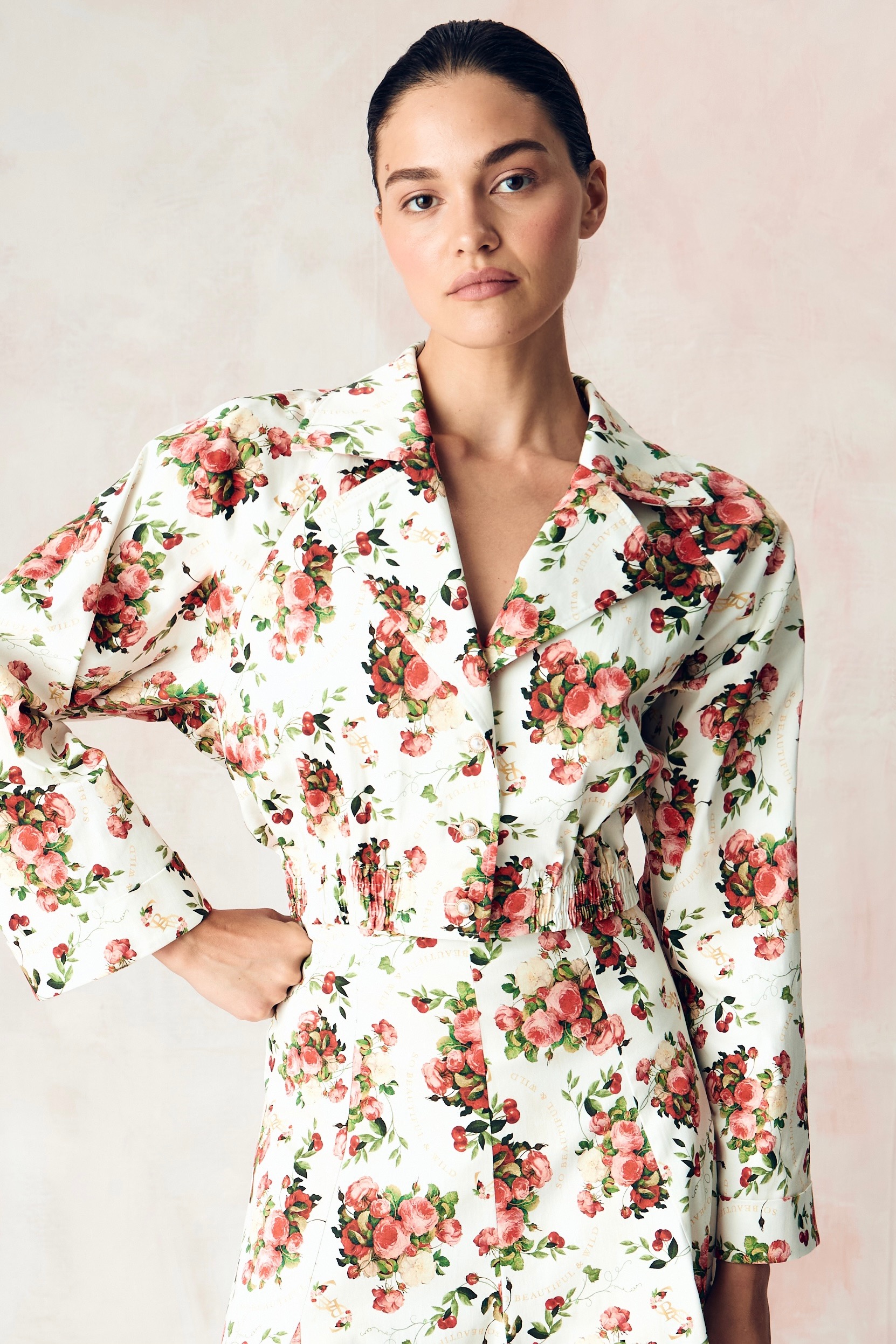 Бомбер из стрейч поплина с авторским принтом «ПИОНЫ И ВИШНИ»